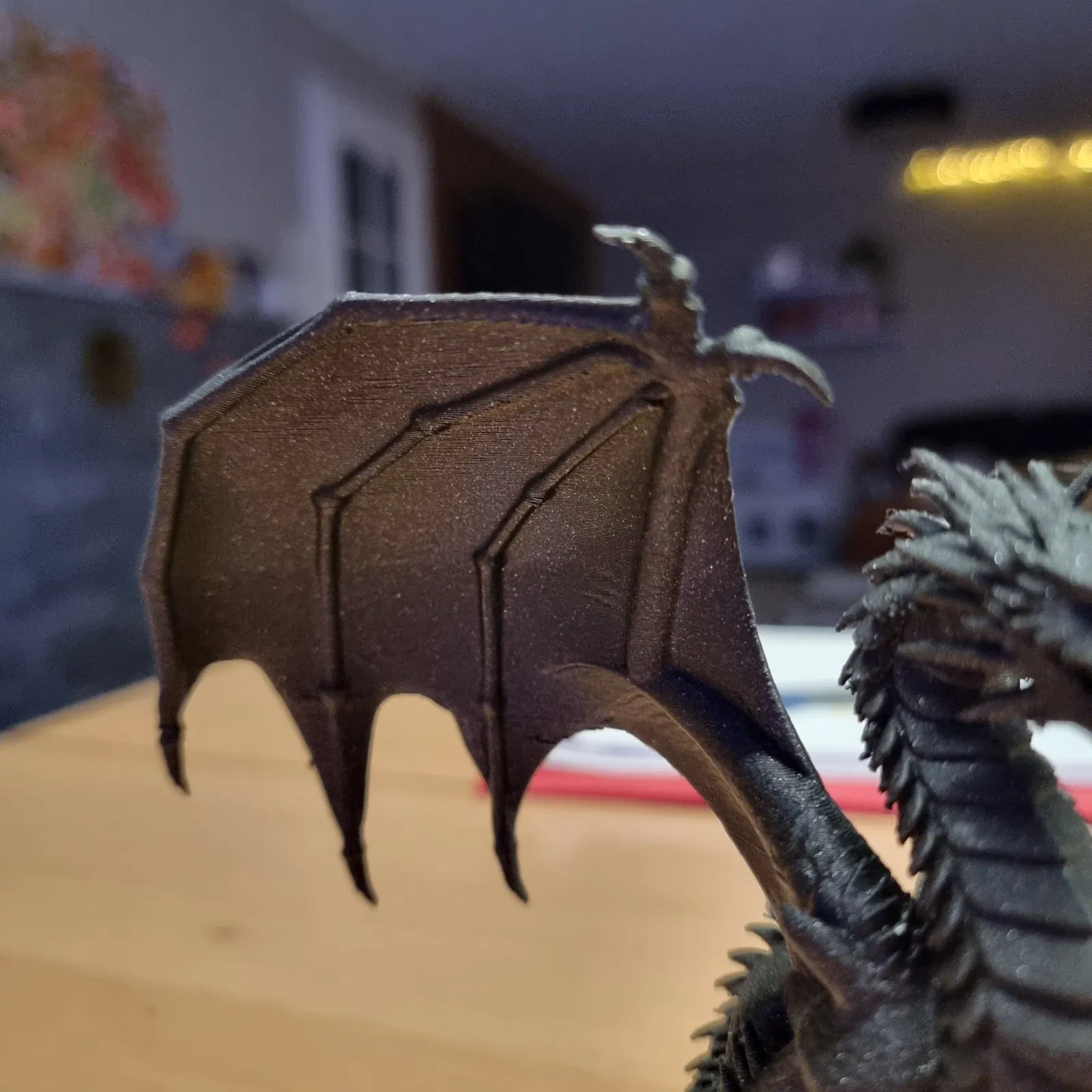 Bề mặt có vảy được chạm khắc tinh xảo, đặc biệt rõ nét dọc theo cổ và thân, mang lại cho bức tượng nhỏ một cái nhìn chân thực, có kết cấu. Nó có đôi cánh to lớn, trông mạnh mẽ dang rộng và hơi chếch lên trên, mô phỏng cấu trúc màng của cánh dơi. Đầu rồng tỉnh táo, quay sang một bên, miệng hơi hé mở, để lộ hàm răng sắc nhọn và gợi ý một tiếng gầm hoặc gầm gừ.