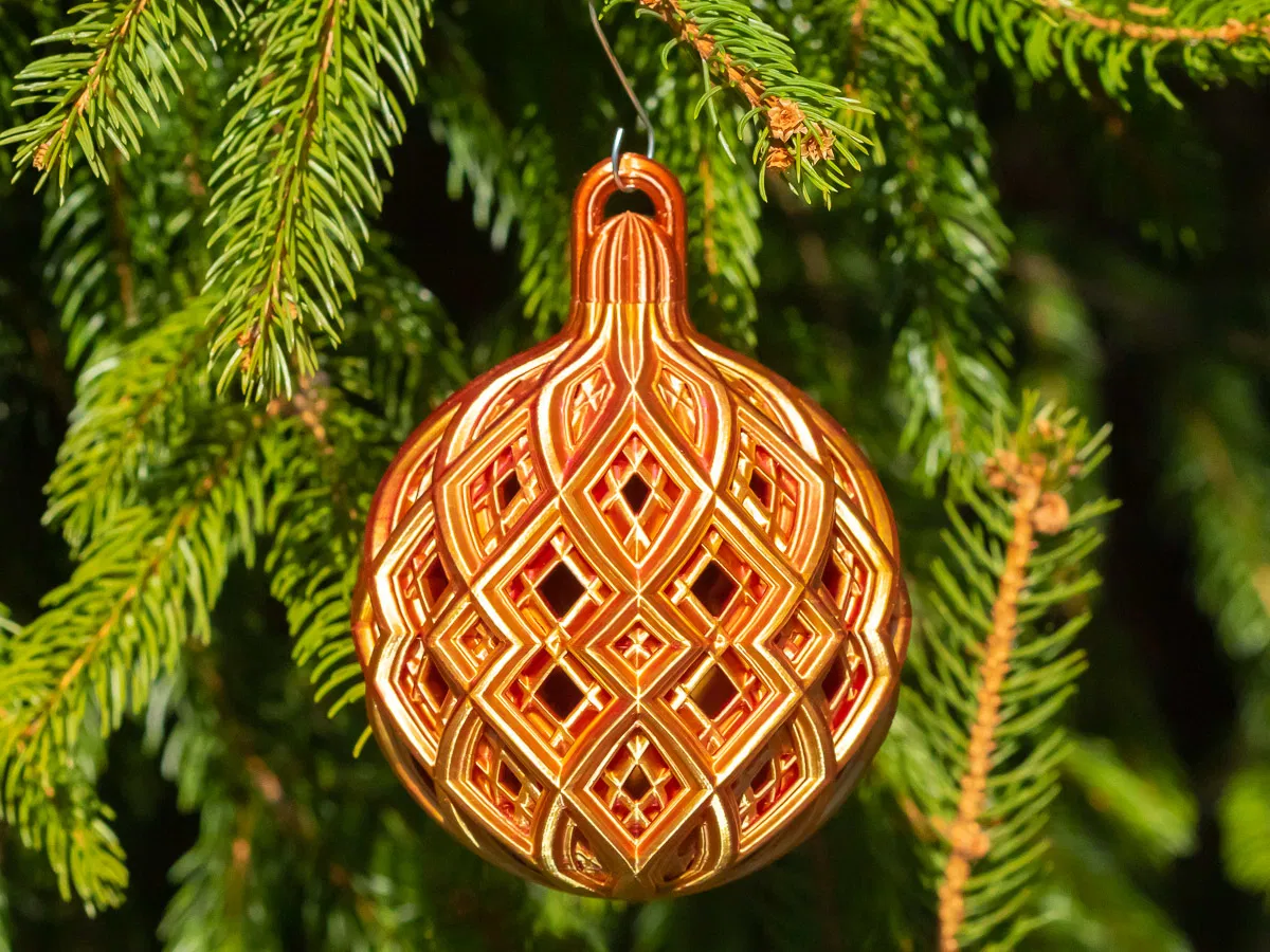 Quả châu Giáng Sinh đẹp mắt, dễ in, trông tuyệt vời ở mọi kích cỡ. Phiên bản 2 mảnh được khuyên dùng để có bề mặt mịn và không cần chống đỡ. Có các tùy chọn kích thước từ mini đến cỡ bưởi, có thể tùy chỉnh thêm.