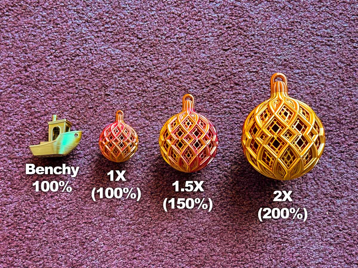 Ban đầu tui thiết kế cái này làm quả trang trí mini. Nhìn ở kích thước đó (1X) là đẹp rồi, nhưng mà để 1.5X và 2X thì còn đẹp hơn nữa. Ở 1X, nó to cỡ trái banh golf. Ở 1.5X, nó là kích thước quả châu thông thường. Ở 2X, nó to cỡ trái bưởi đó. Bạn có thể phóng to thêm nữa nếu muốn nha. Tui đoán chắc đa số mọi người sẽ in ở 1.5X, nên tui lấy đó làm thời gian ước tính đó.