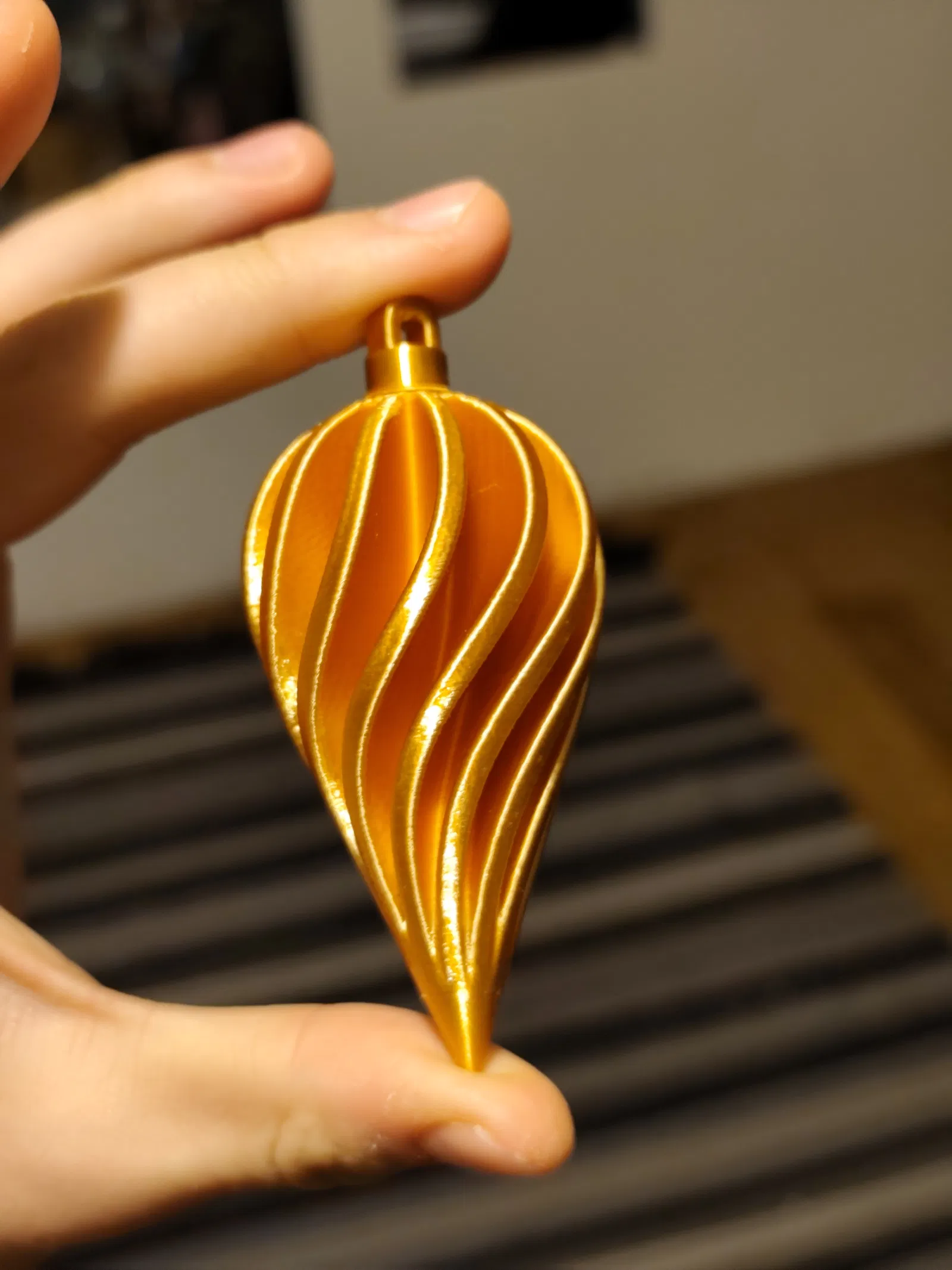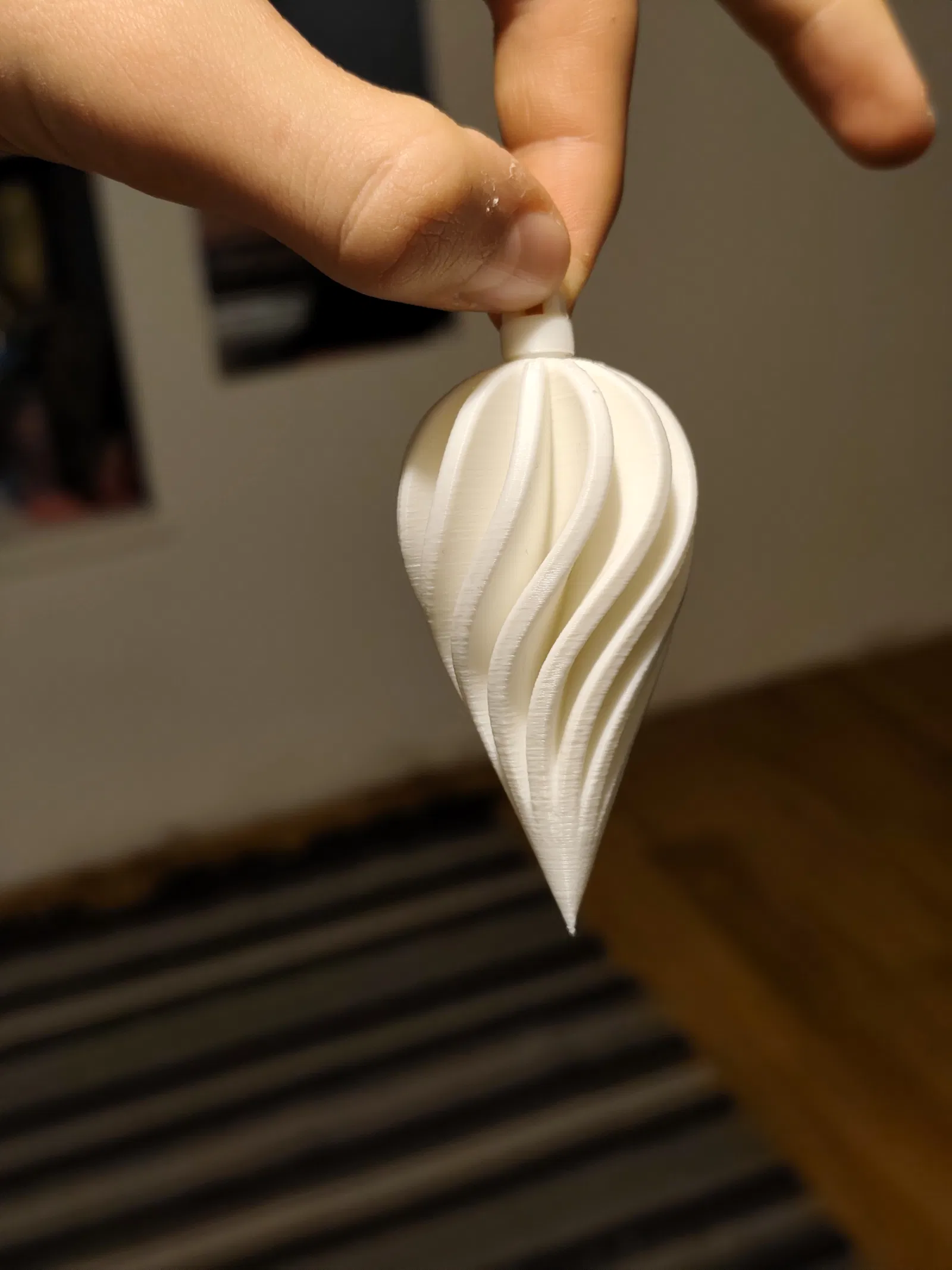 Mình khuyên bạn nên in ở độ phân giải 0.16mm, dùng "tree supports" cho phần dưới của xoắn ốc và in ngược lại (phần móc treo ở trên khay in). Phần móc treo không cần "supports" đâu.