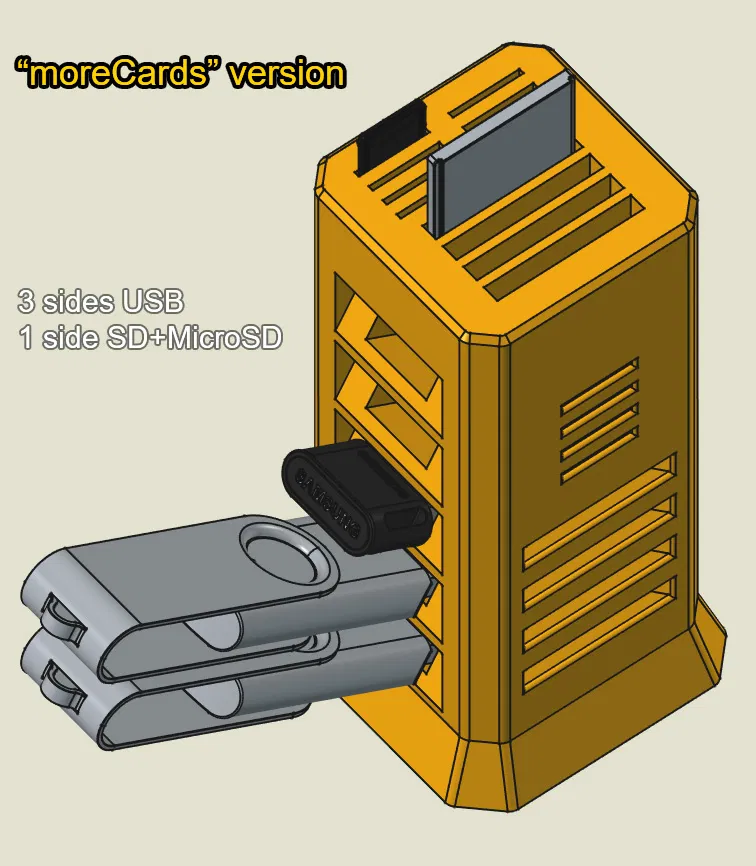 Cập nhật (tháng 11/2025): Sau khi chuyển từ Fusion sang FreeCAD, tui thử làm lại cái tháp USB như một bài tập FreeCAD và làm ra một phiên bản hơi khác. Nó thấp hơn chút (5 khe USB thay vì 6) và thay vì 4 mặt có khe USB, tui đổi 1 mặt thành 4 khe SD + 4 khe MicroSD.