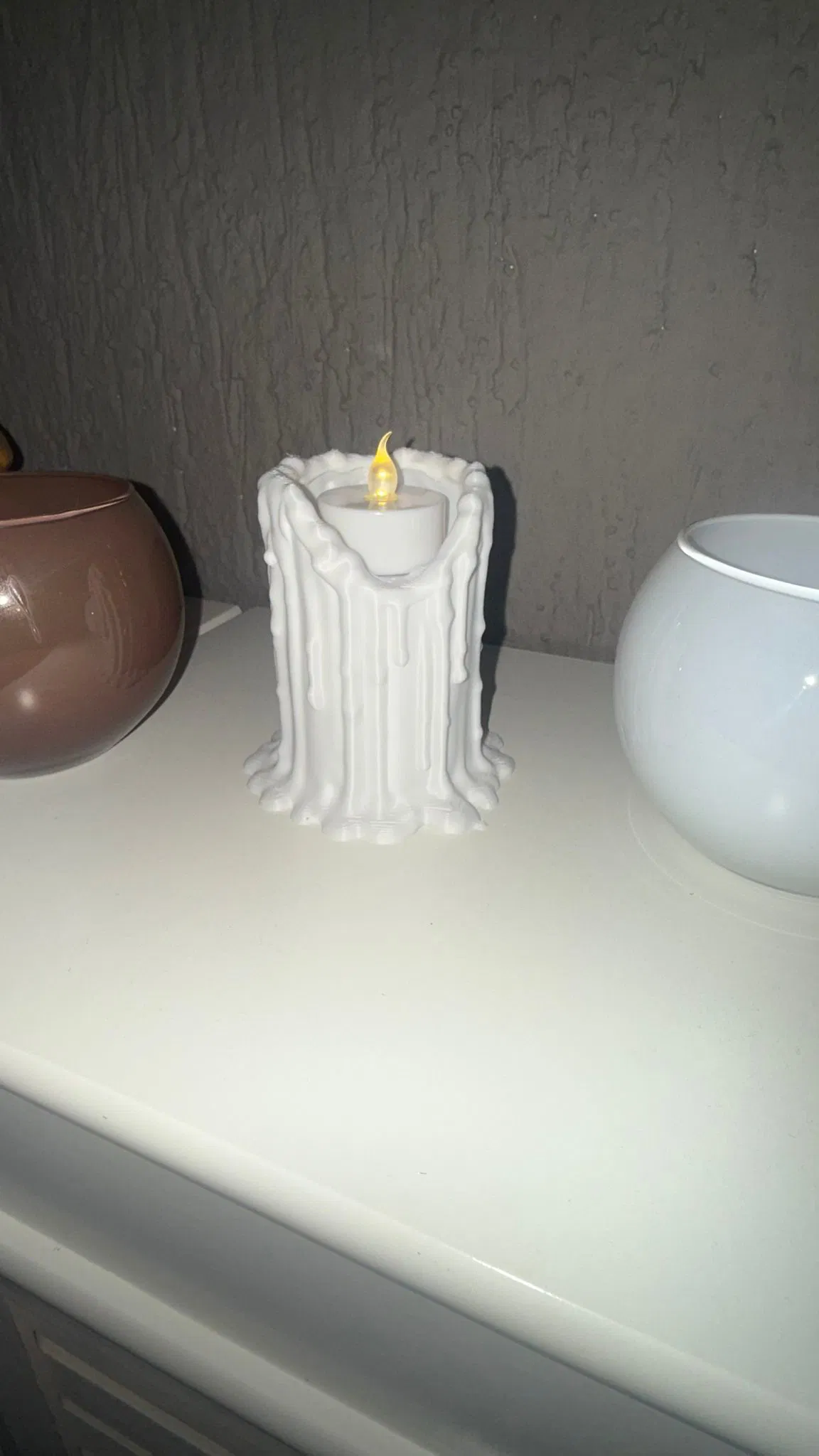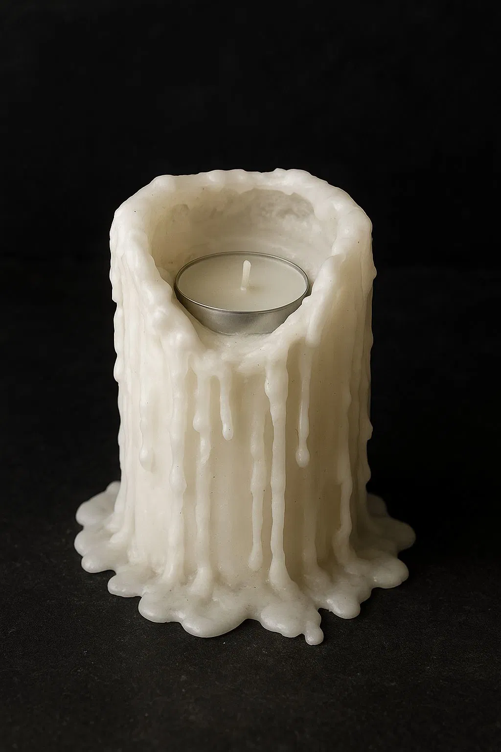 Đây là một cái đui đèn LED trông giống như một cây nến đang tan chảy. Do thành bên thấp nên có thể sử dụng nến tealight thật mà không gặp vấn đề gì.