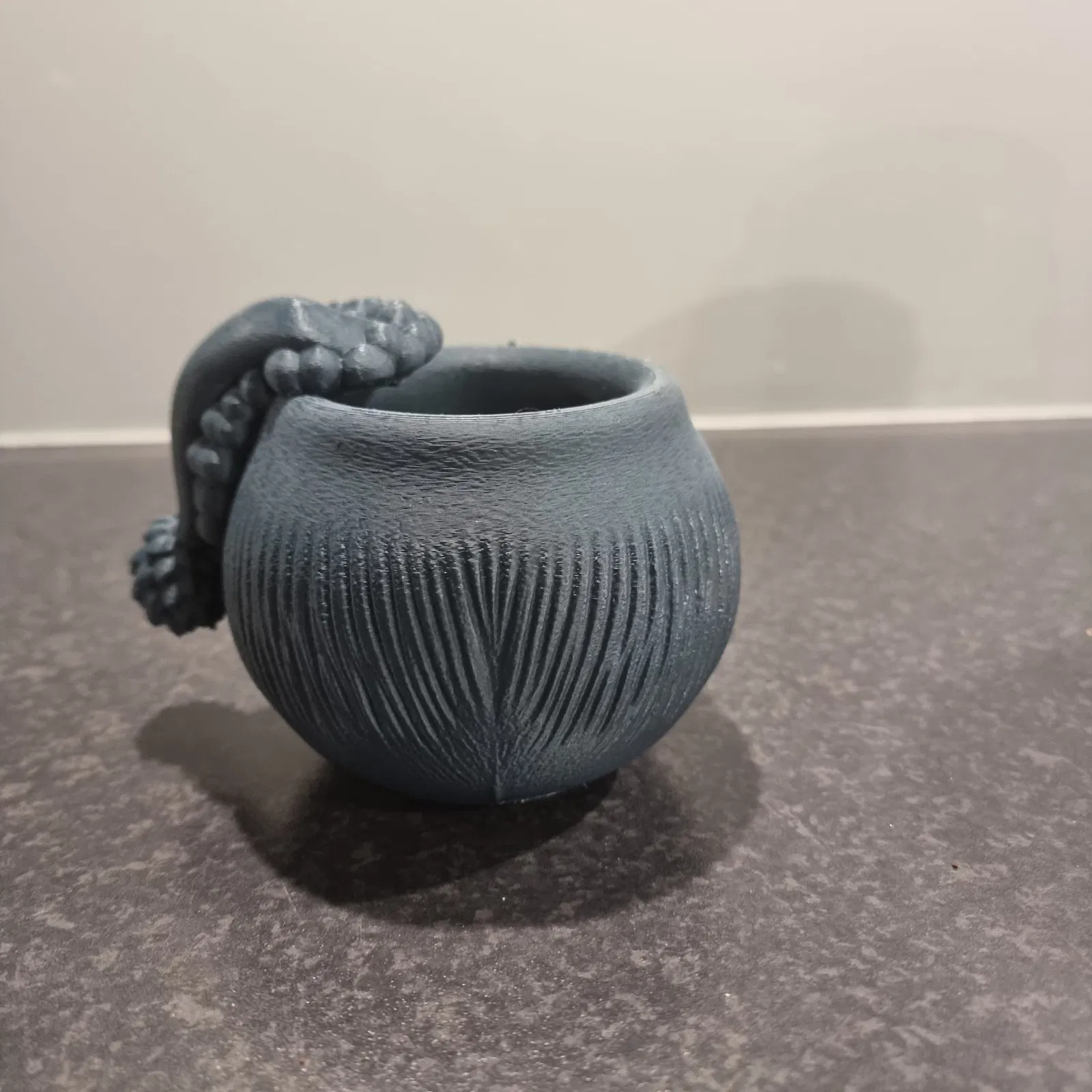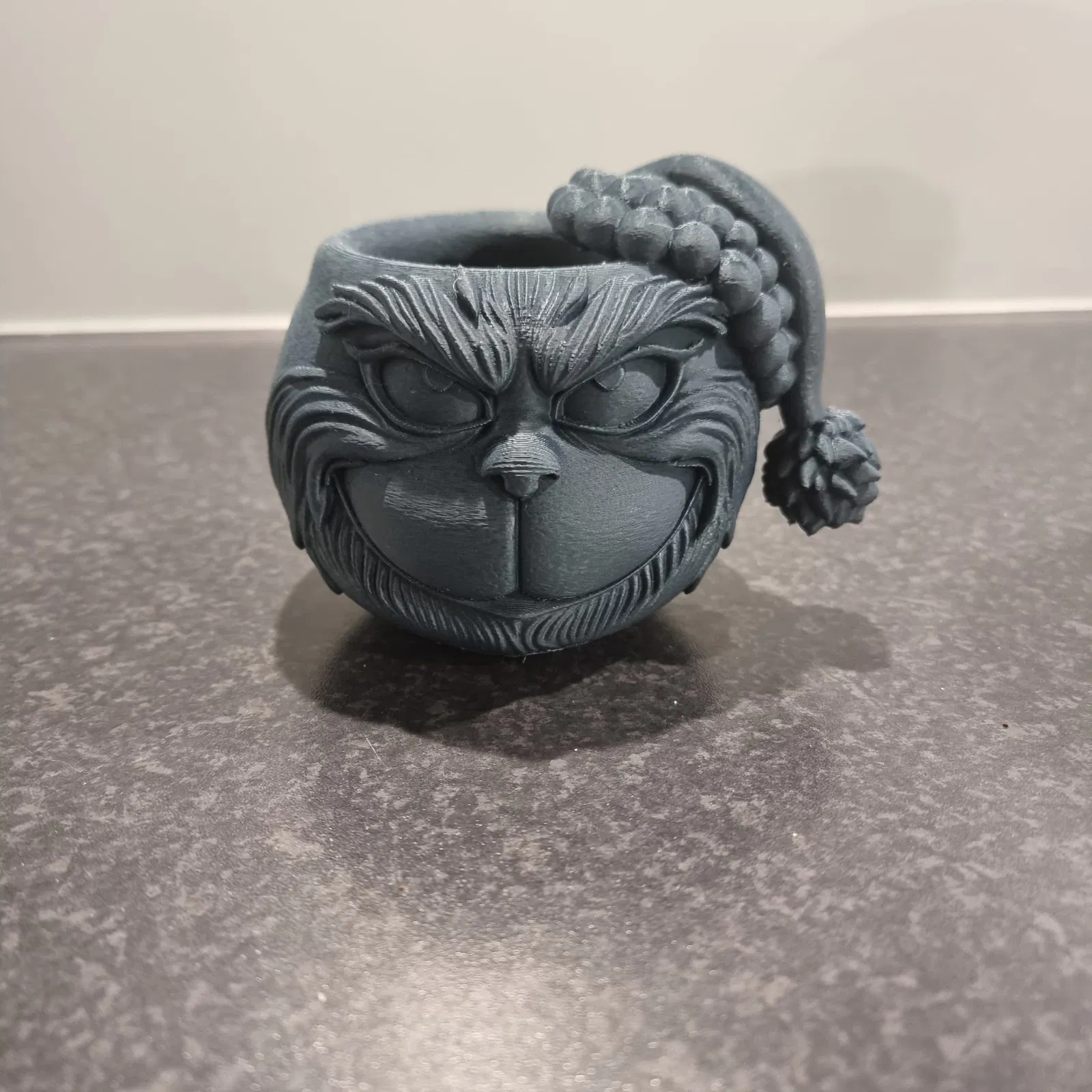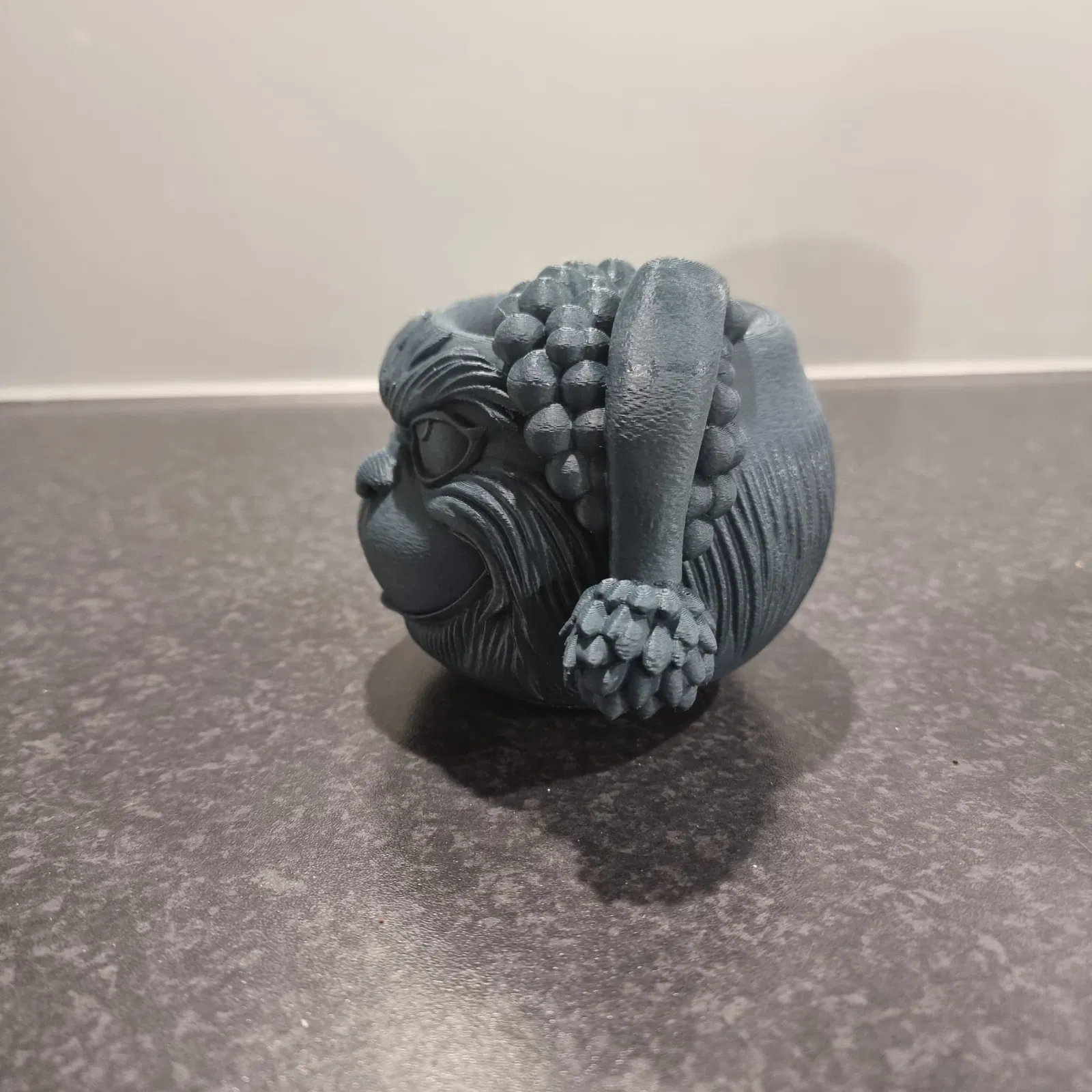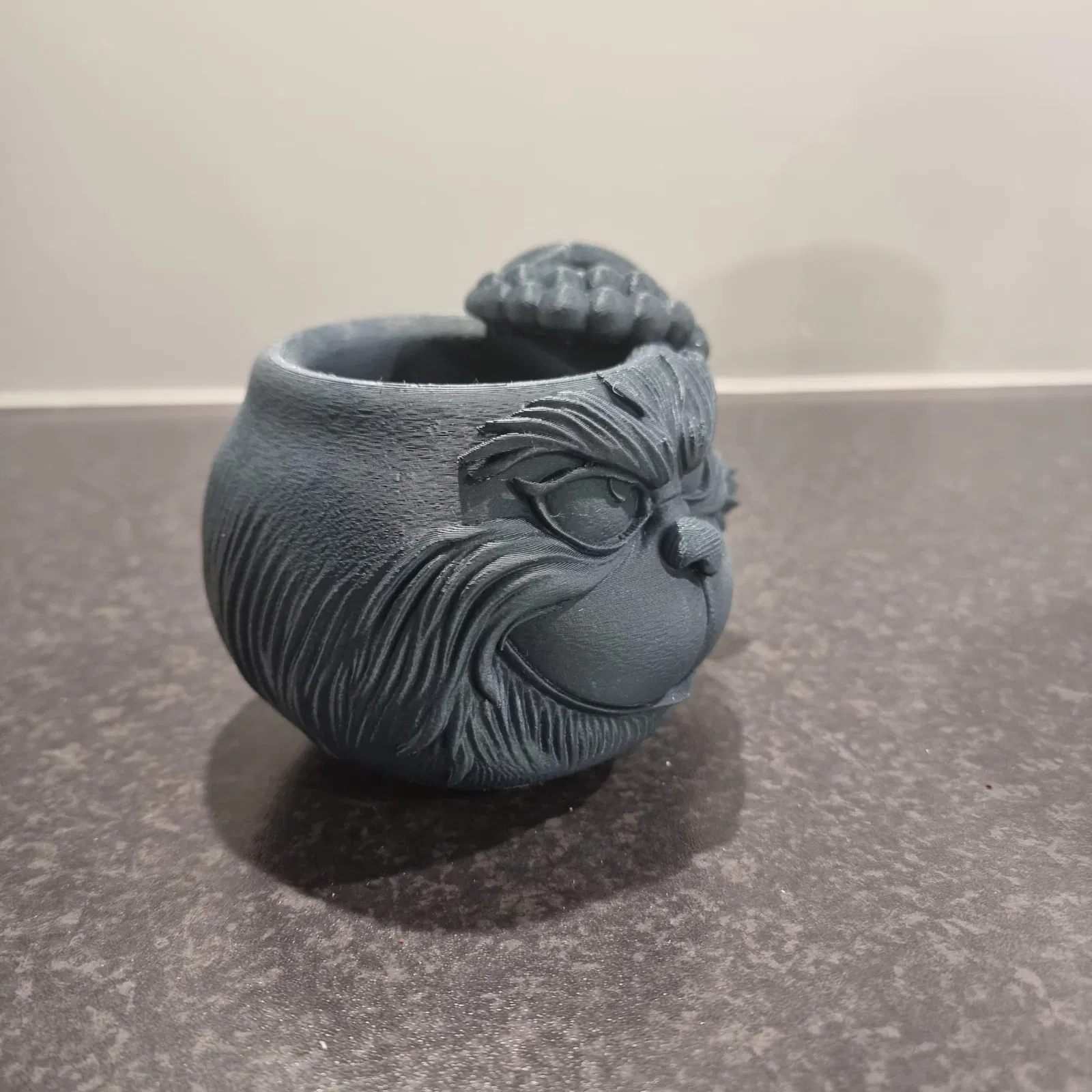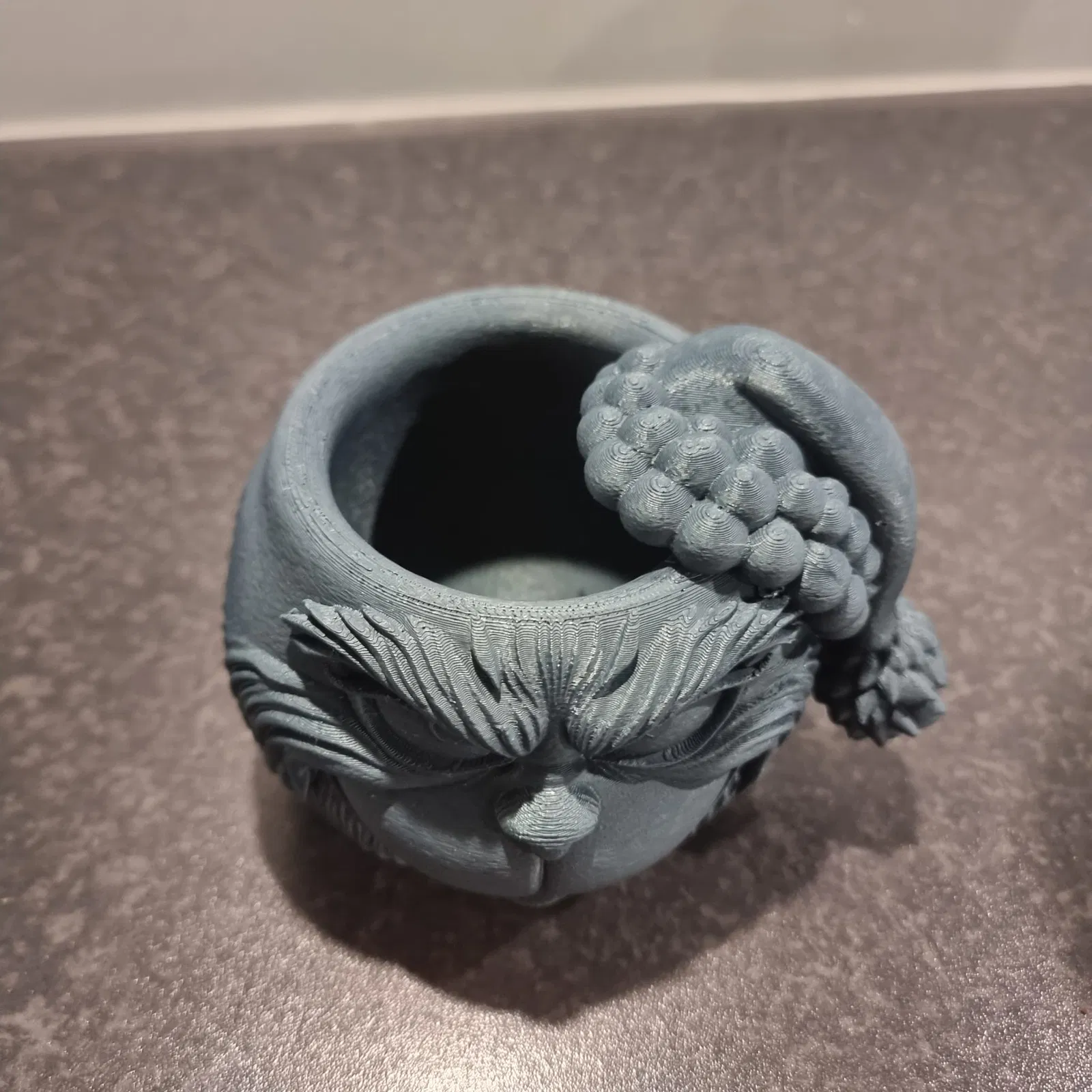 Cái vân của bản in tạo cảm giác như lông hoặc điêu khắc thô, nặng. Hình dáng giống đầu của Grinch đội mũ ông già Noel đan len. Nó có vẻ mặt tinh ranh và hiện đang chứa đầy vài viên kẹo bọc màu cam và vàng sặc sỡ. Nó đóng vai trò như một món ăn trang trí, mừng lễ hội.