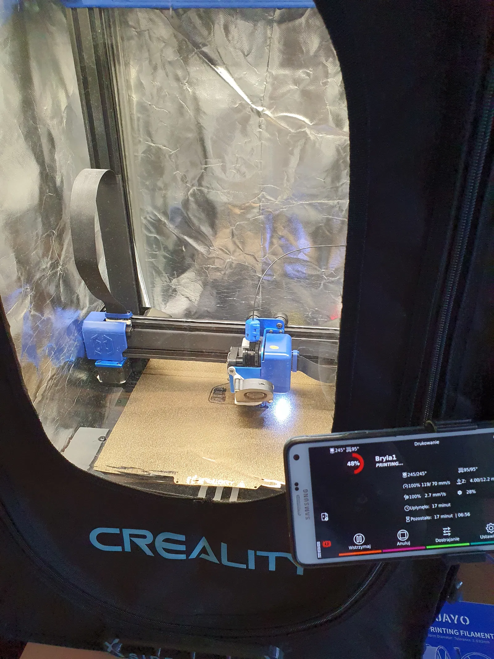Nhiệt độ trong khoang máy đạt 40 độ C khi in ABS/ASA - đầu phun 245 độ C, bàn nhiệt 100 độ C.