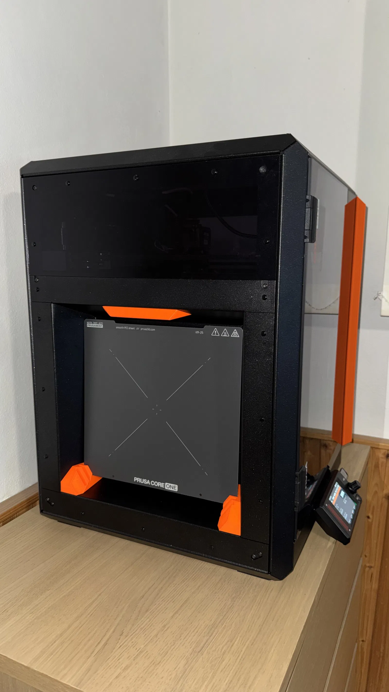 Mình tìm cách tận dụng không gian trên chiếc Prusa Core One của mình và đồng thời tìm chỗ để mấy tấm đế in tháo rời cho máy in 3D, mà lại không thấy có mẫu tối giản nào thực sự hợp với thiết kế của máy. Thế là mình tự thiết kế 💎 của riêng mình, lấy cảm hứng từ cả logo Printables lẫn vẻ ngoài của Core One.