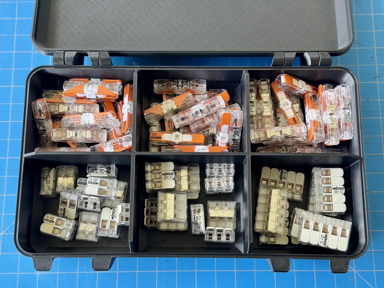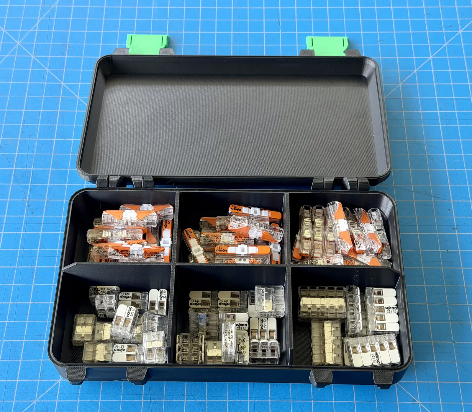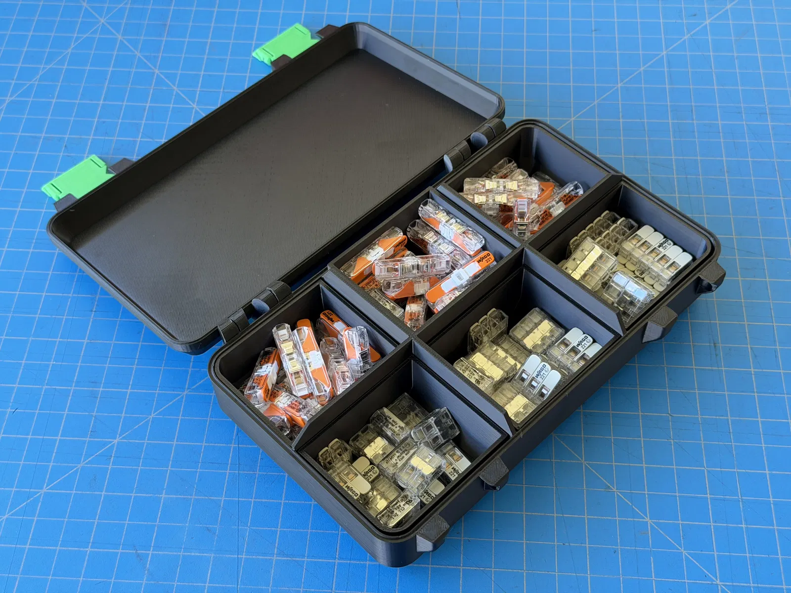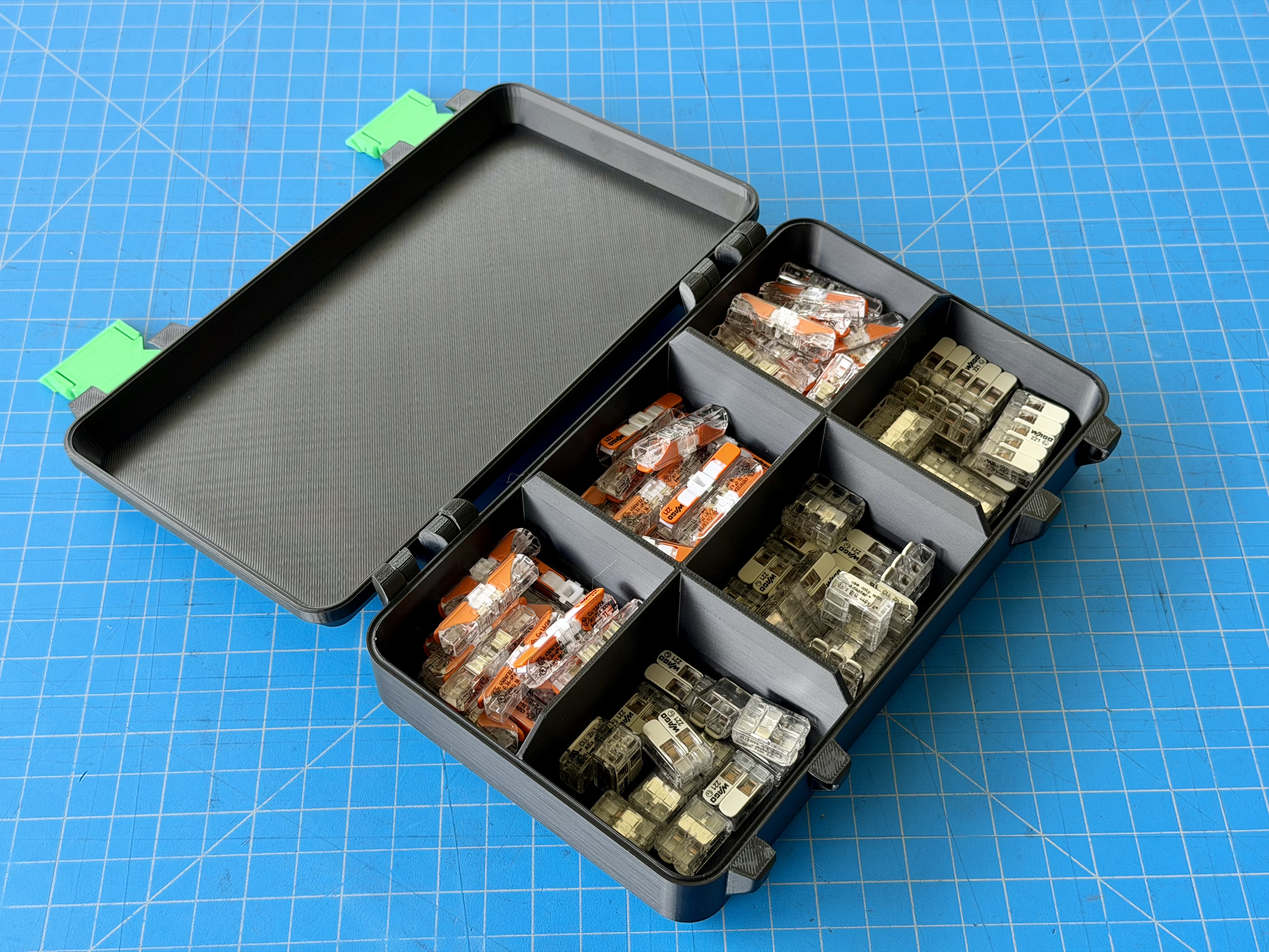 Tui đã chỉnh sửa mô hình của EccentricToast để có thêm nhiều ngăn và khay tháo rời tùy chọn. Hộp này cực kỳ tiện lợi để sắp xếp đồ đạc, đặc biệt là các loại đầu nối Wago. In ấn dễ dàng không cần support.