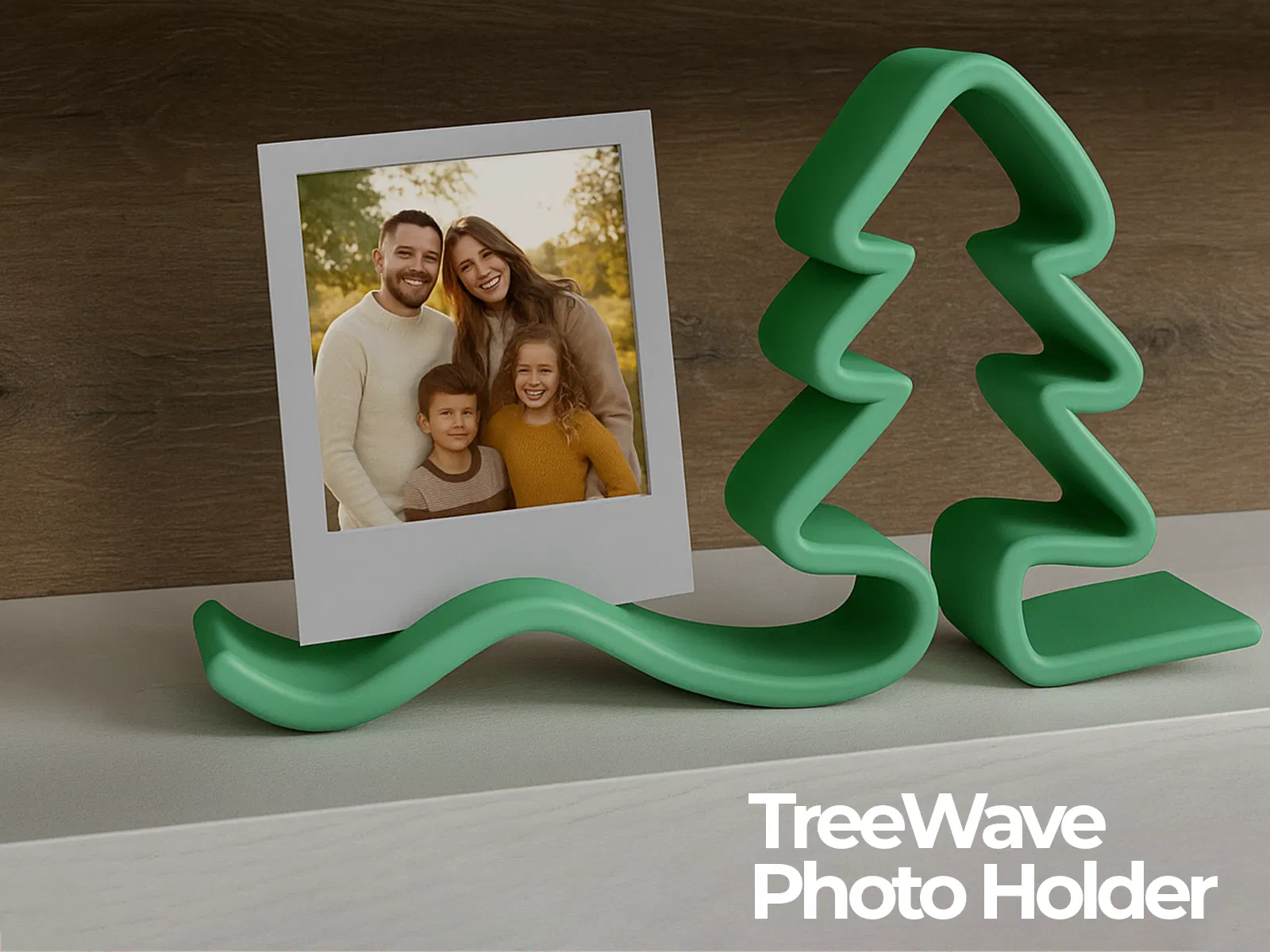 Giá đỡ ảnh 3D tối giản hình cây thông Noel cách điệu uốn lượn. Thiết kế lượn sóng mượt mà, nâng đỡ những kỷ niệm yêu thích của bạn một cách tinh tế, kết hợp nét duyên dáng ngày lễ với đồ trang trí hiện đại. Hoàn hảo để trưng bày ảnh Polaroid hoặc ảnh in nhỏ trên kệ và bàn làm việc trong mùa lễ hội hoặc quanh năm.