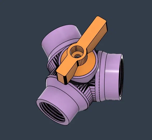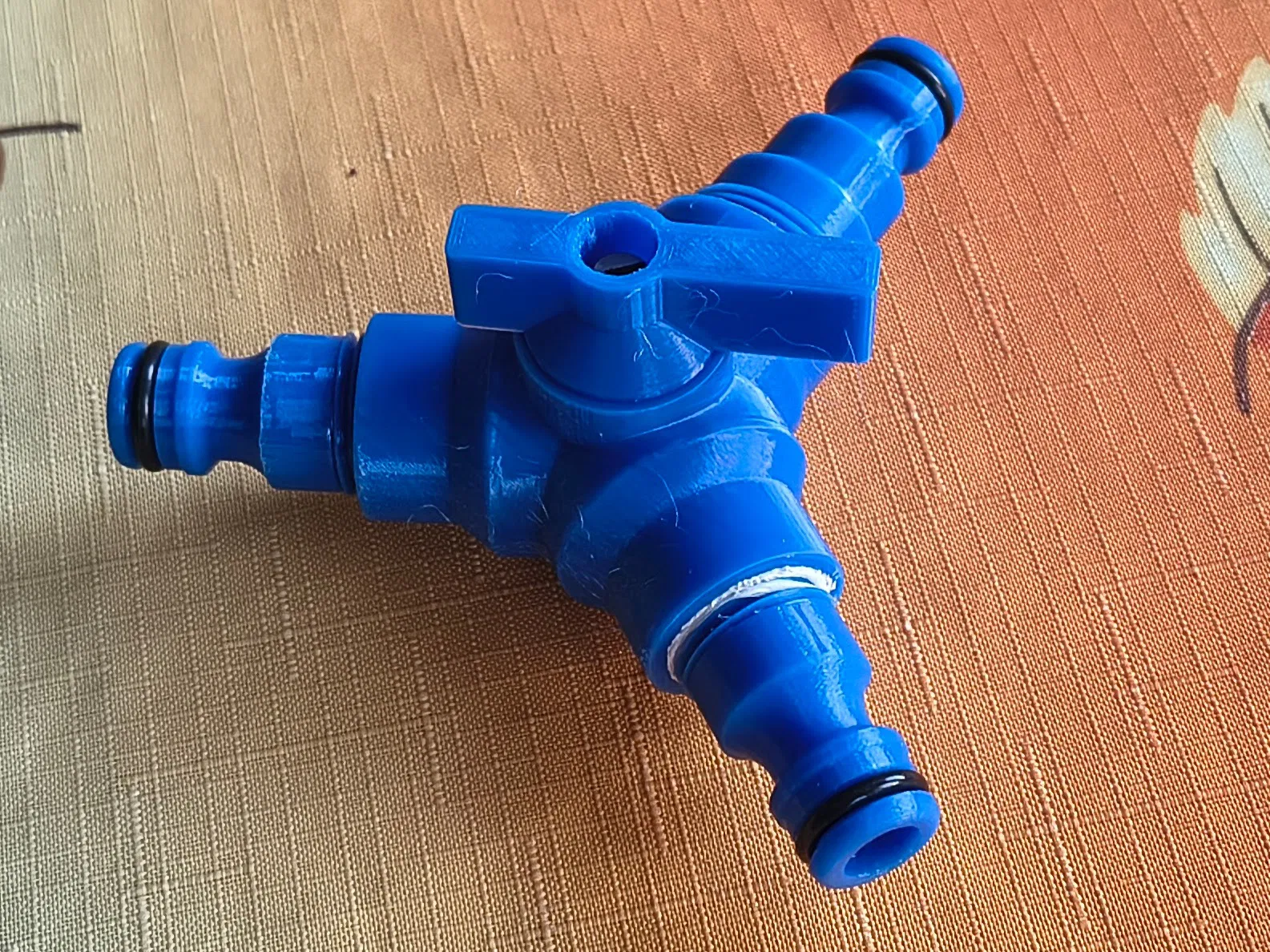 Van bi 3 ngã có o-ring, các bộ phận có thể sửa chữa được. Kích thước o-ring: 10x2mm (2 cái), 16x2,5mm (3 cái), 11,5x2,5mm (1 cái cho đuôi). Khuyến khích in với nozzle 0.4mm, lớp dày 0.15mm, vật liệu PETG. Dùng vít M4x12mm. Van không dùng cho áp suất cao.