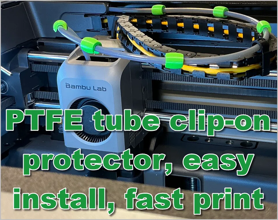 Bảo vệ ống PTFE của bạn khỏi bị mài mòn do cọ xát vào cửa sổ phía trên trên các máy BambuLab P2S, P1S, X1C. Dễ dàng lắp đặt, chỉ cần kẹp vào ống, không cần tháo ống. In bằng PETG và điều chỉnh kích thước nếu cần.
