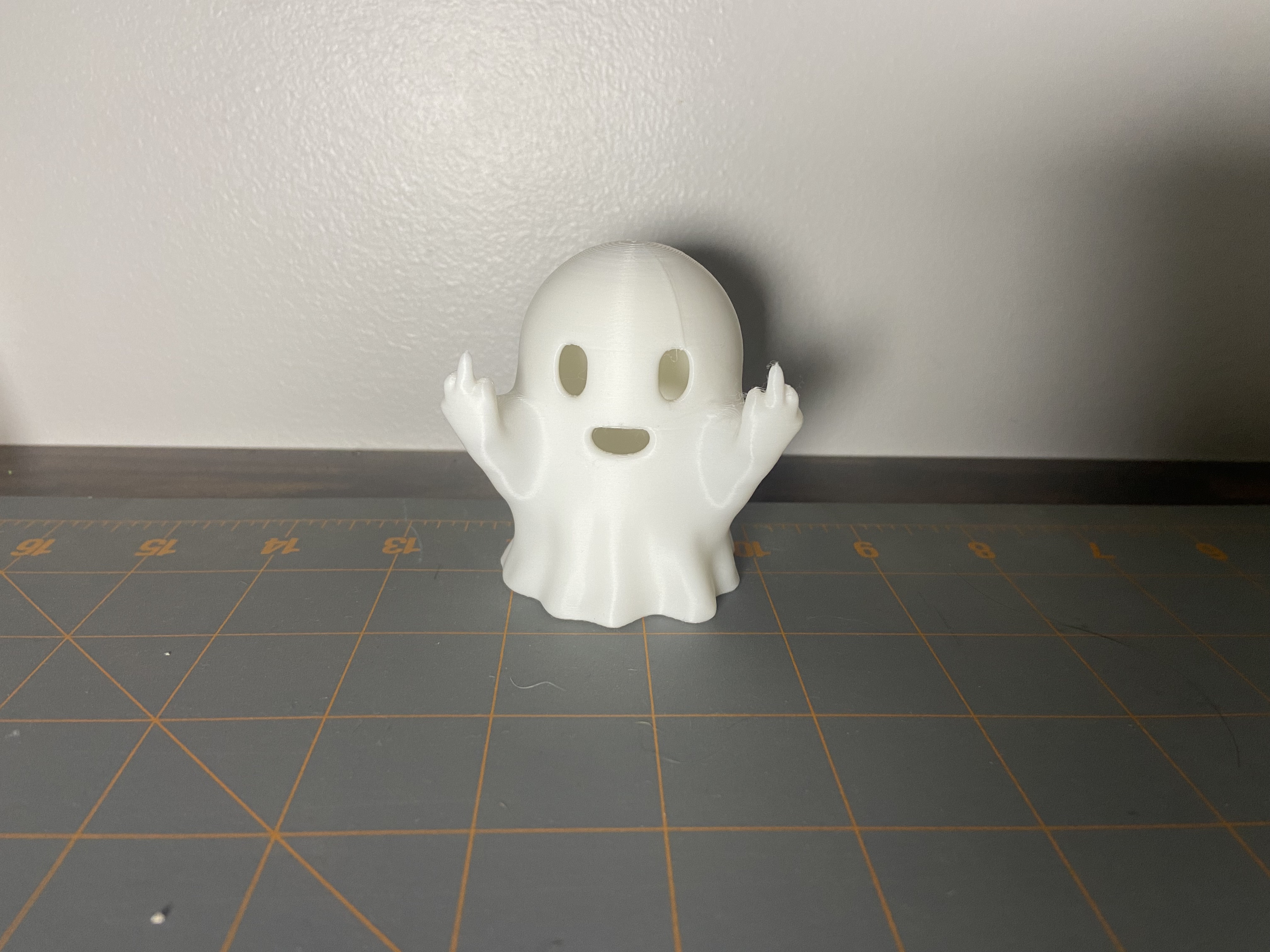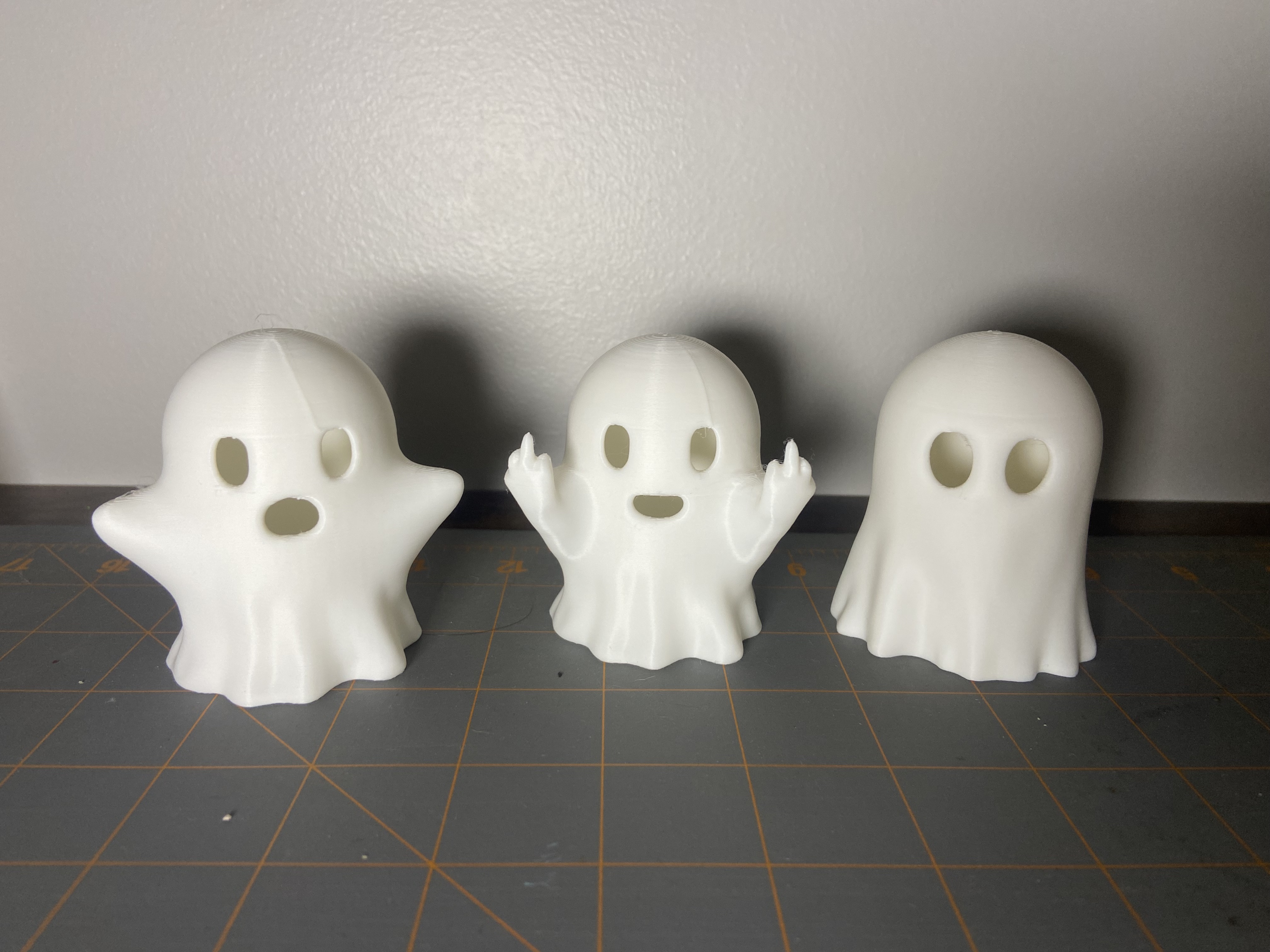 Ba mô hình bóng ma dễ thương dùng để trang trí Halloween, có thể đặt đèn trà vào bên trong. Mô hình giơ ngón giữa cần giá đỡ, còn hai mẫu kia thì không. Tối ưu hóa để ánh sáng xuyên qua tốt, in với 0% infill và 2 lớp thành.