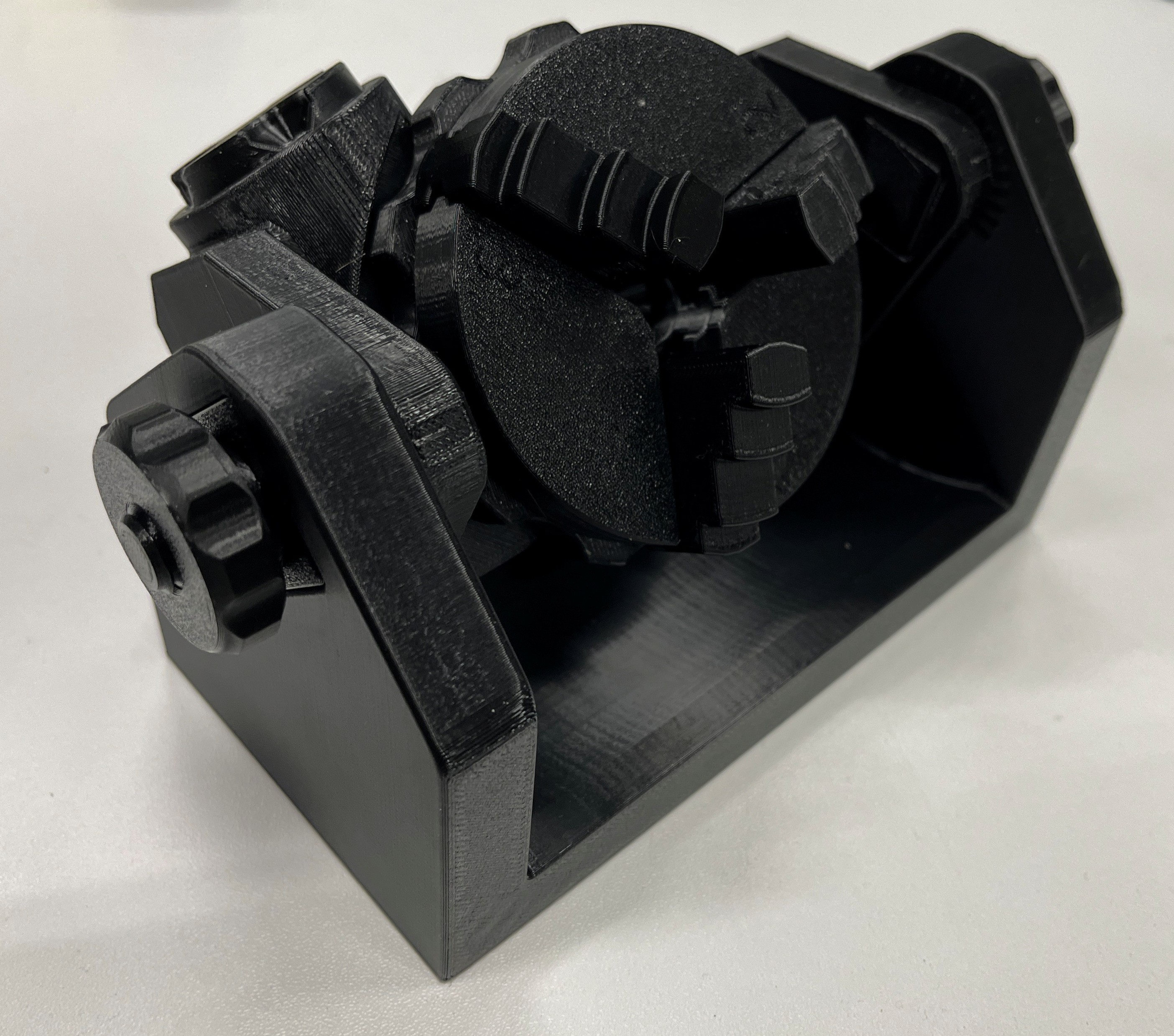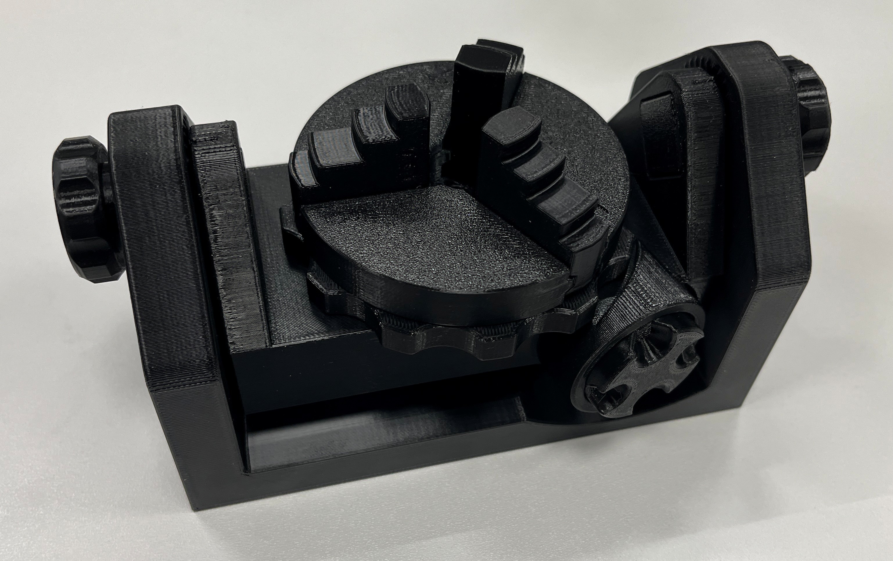Mô tả thiết bị kẹp xoay cho các chi tiết tròn. Hướng dẫn chi tiết cách in các bộ phận như support, body, spindle, tension wheel, jaw, v.v. với độ cao lớp và cách đặt in phù hợp. Lưu ý số lượng bộ phận cần in và cách lắp ráp.