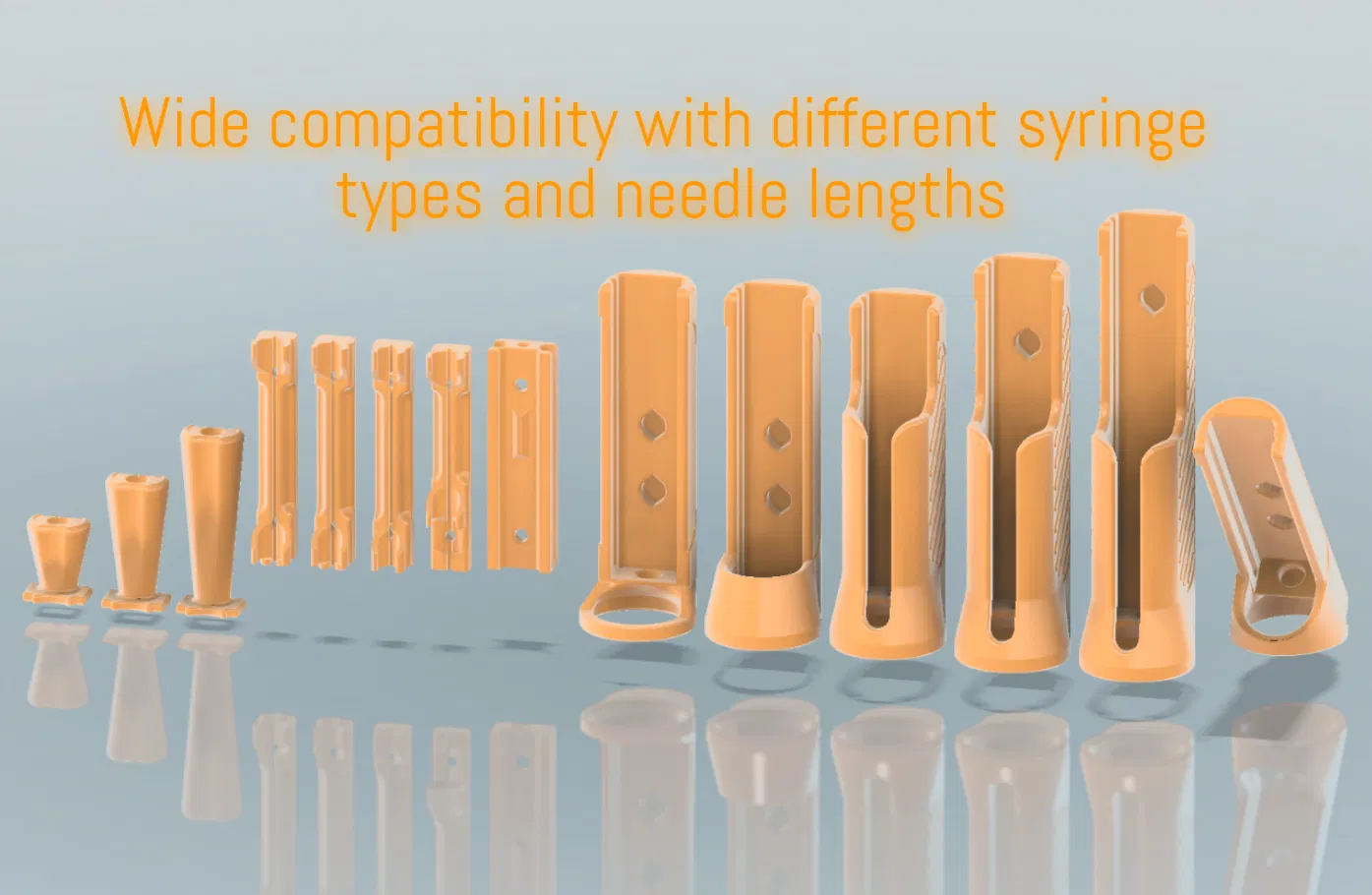 Thiết bị hỗ trợ tiêm thuốc tự động bằng nam châm, giảm lo lắng cho người dùng. Tương thích nhiều loại kim và ống tiêm, dễ dàng lắp ráp, phù hợp tiêm Insulin, GLP-1, TRT.