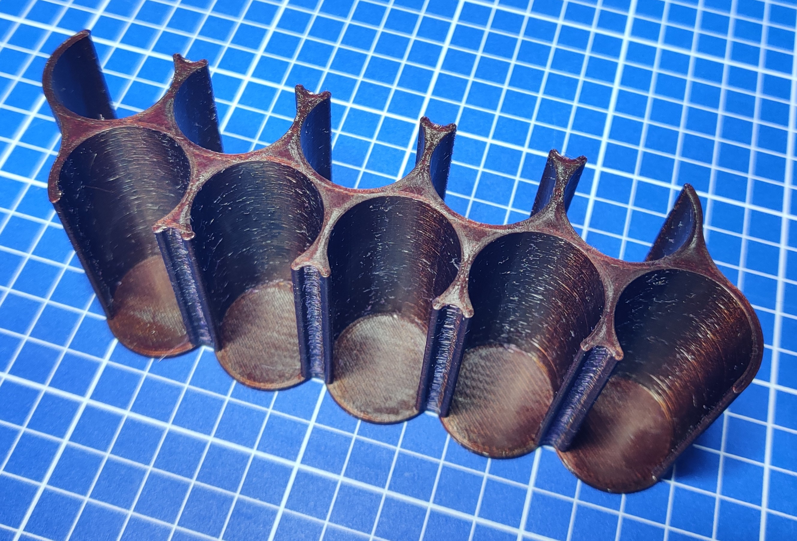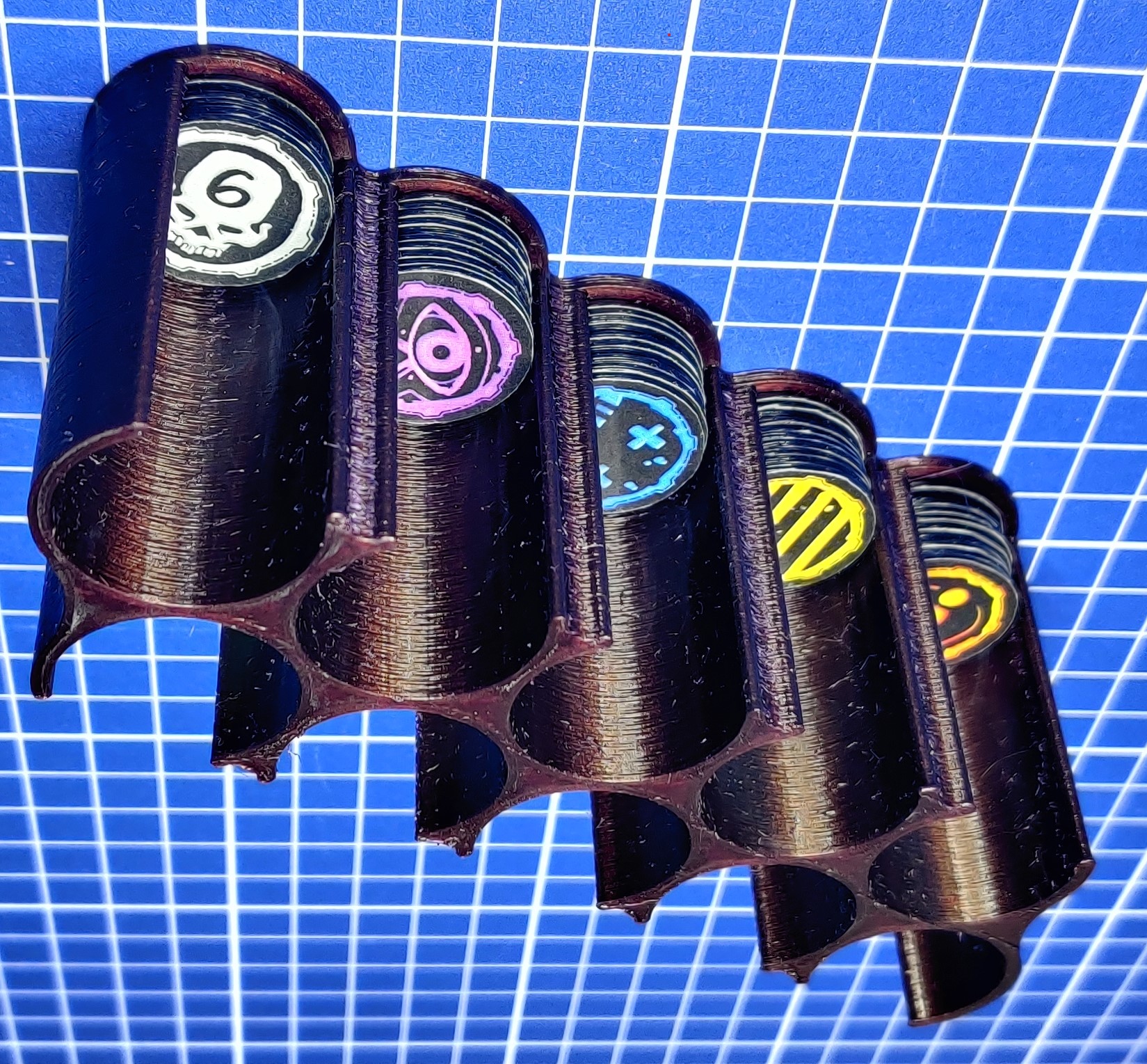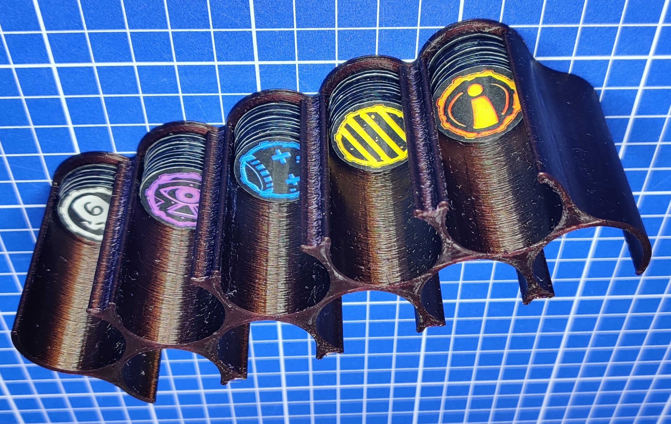 Nó có 2 hàng, mỗi hàng 5 khe để đựng token. Nếu bạn cần hộp lớn hơn hoặc nhỏ hơn, hoặc có đường kính hay chiều cao khác, hãy cho mình biết trong phần bình luận và mình sẽ thiết kế cho bạn. Thiết kế gốc của mình có tham số đầy đủ, nên có thể dễ dàng điều chỉnh cho phù hợp với nhu cầu của mọi người.