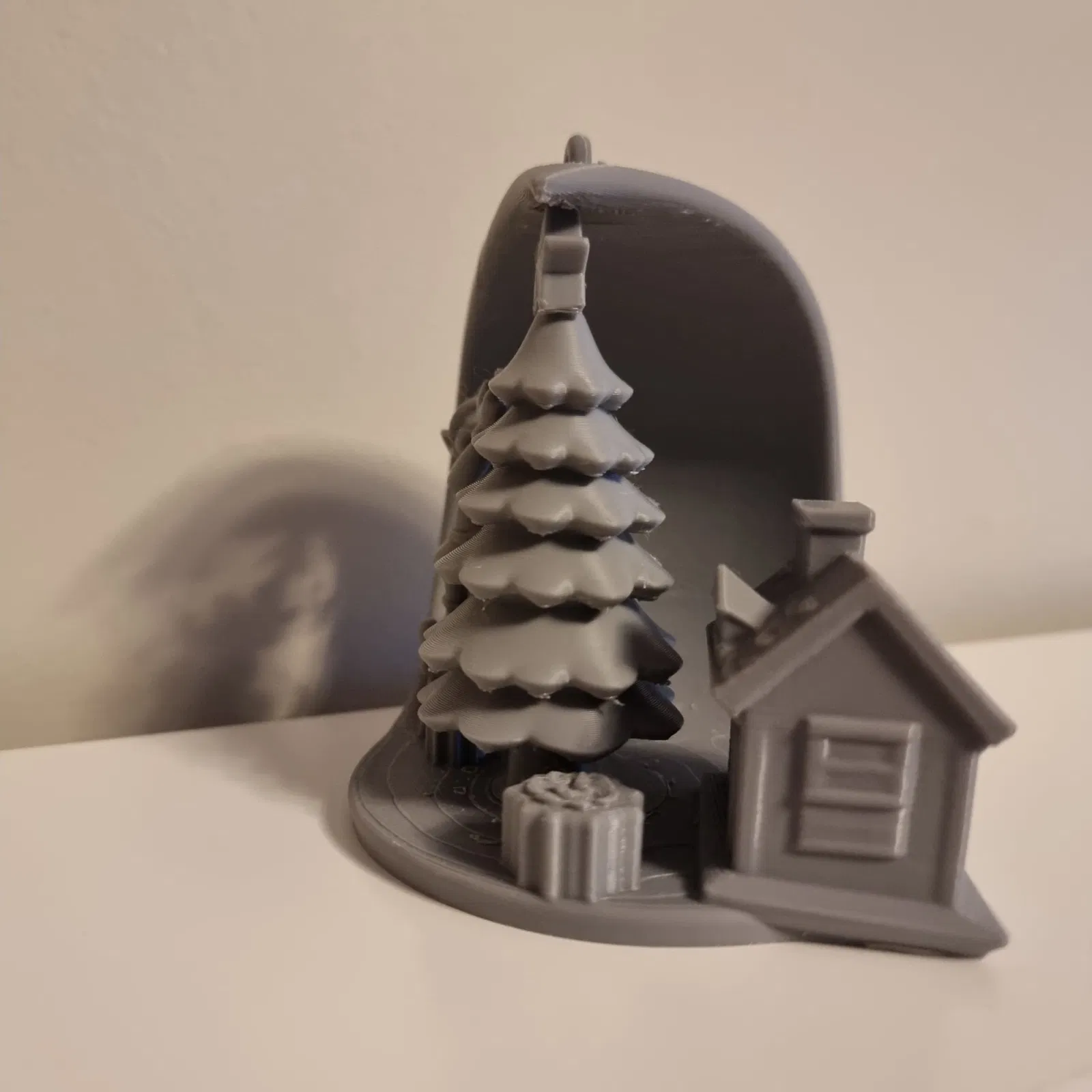 Trung tâm là một cây thông Noel đang được trang trí bởi một chú lùn nhỏ đứng trên ghế đẩu. Phía sau có một ngôi nhà nhỏ và vài hộp quà dưới gốc cây. Có một vòng treo phía trên để có thể treo lên.