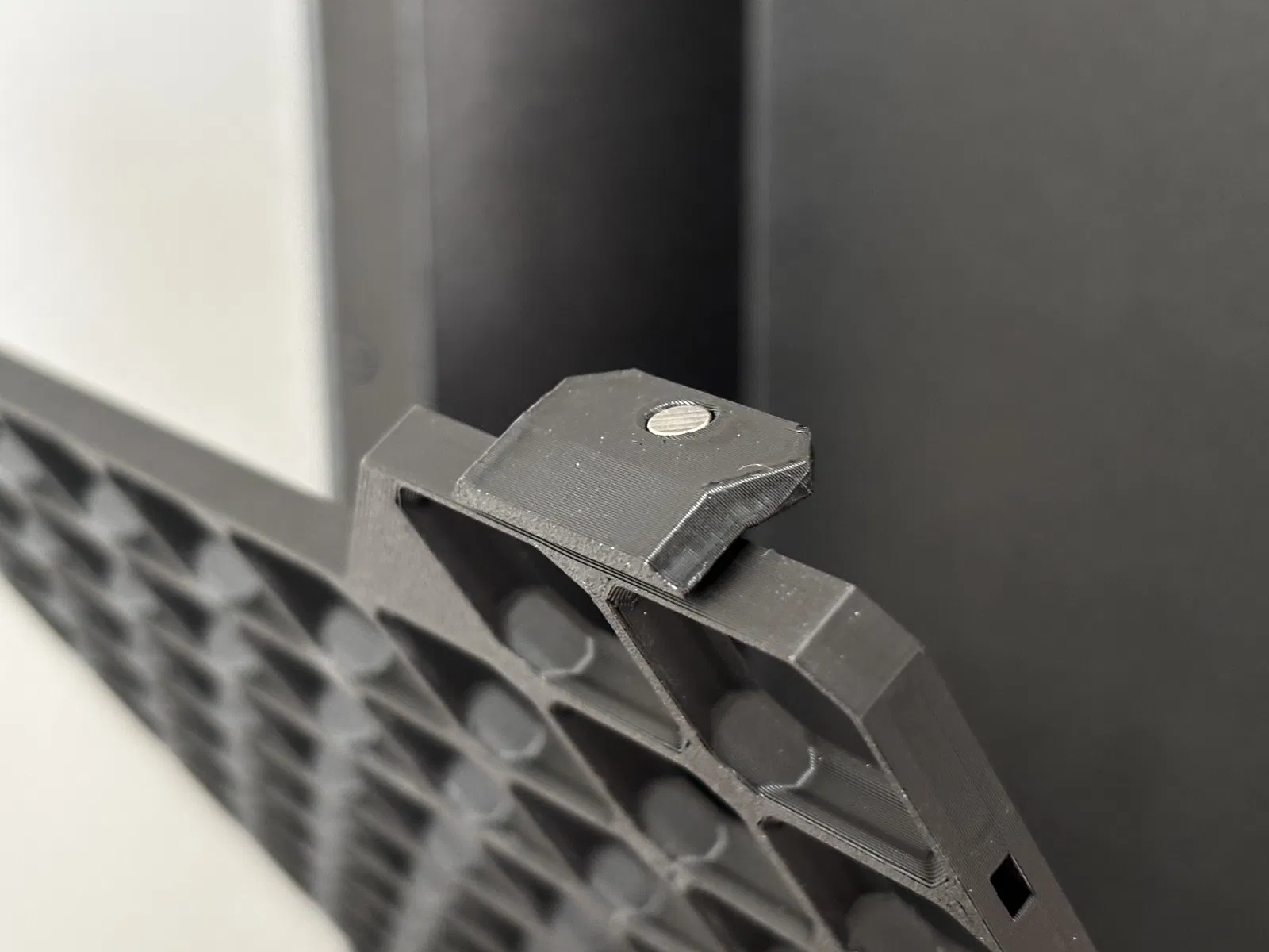 - Lẫy khóa nam châm góc vào phần trên của header. Phần góc có nam châm sẽ phẳng với tấm kim loại góc bên trong phía trên của tấm hông Core One khi gắn vào.