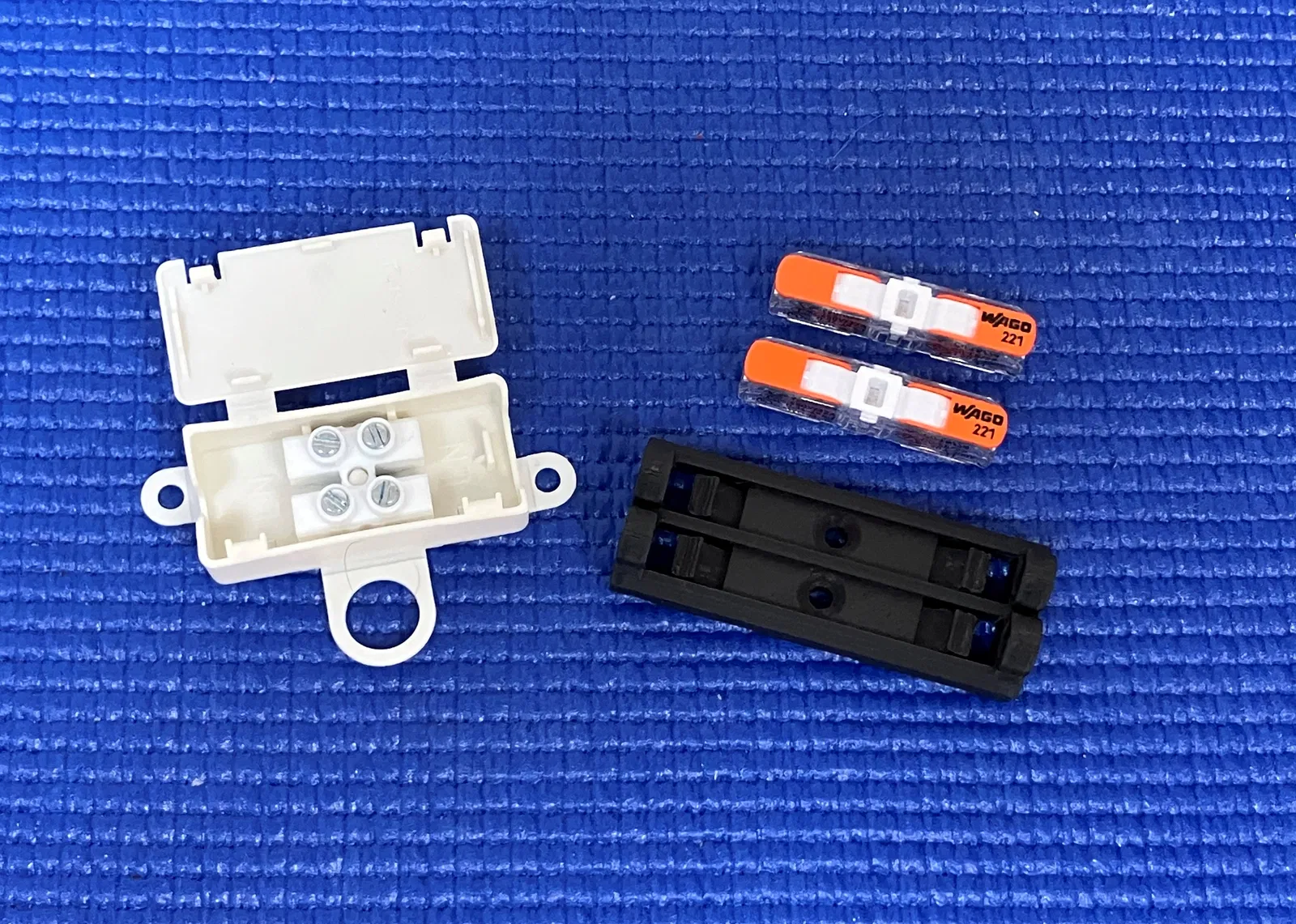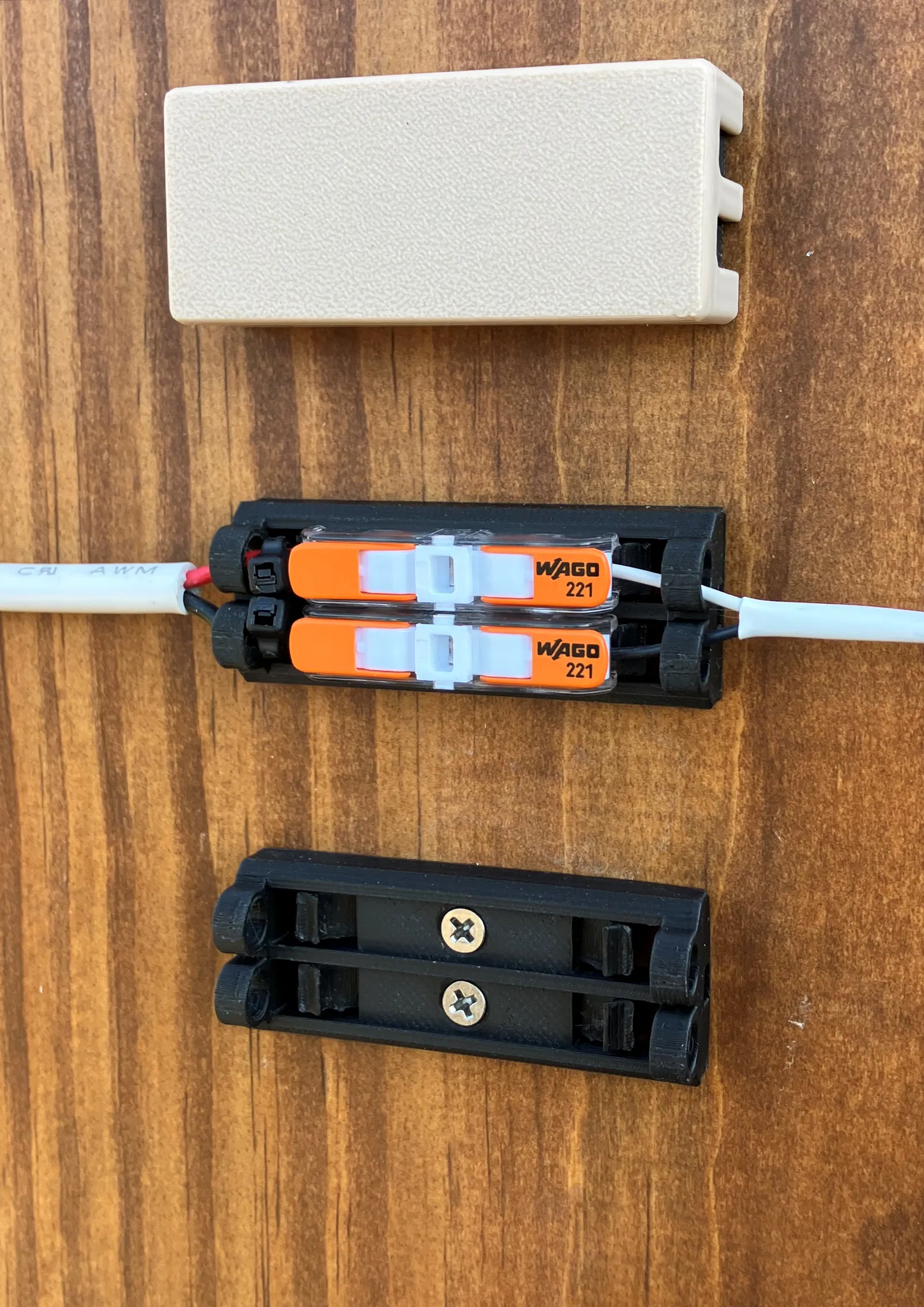 Trước khi tậu được cái máy in 3D, tui toàn xài cái hộp đấu nối kiểu cũ (cọc đấu dây vặn xoắn) cho mấy vụ lắp đèn LED dưới tủ bếp. Kiểu WAGO này nè là cải tiến vượt bậc, dễ dàng bắt vít bằng con vít đầu bằng #4 x 1/2” và có luôn chỗ gắn dây rút để chống tuột (như trong hình). Mấy cái cầu nối WAGO 221-2401 kiểu nối thẳng vô là nó tự snap dính vô ngon lành. Cái nắp cũng snap vô luôn, nhìn gọn gàng đẹp mắt.