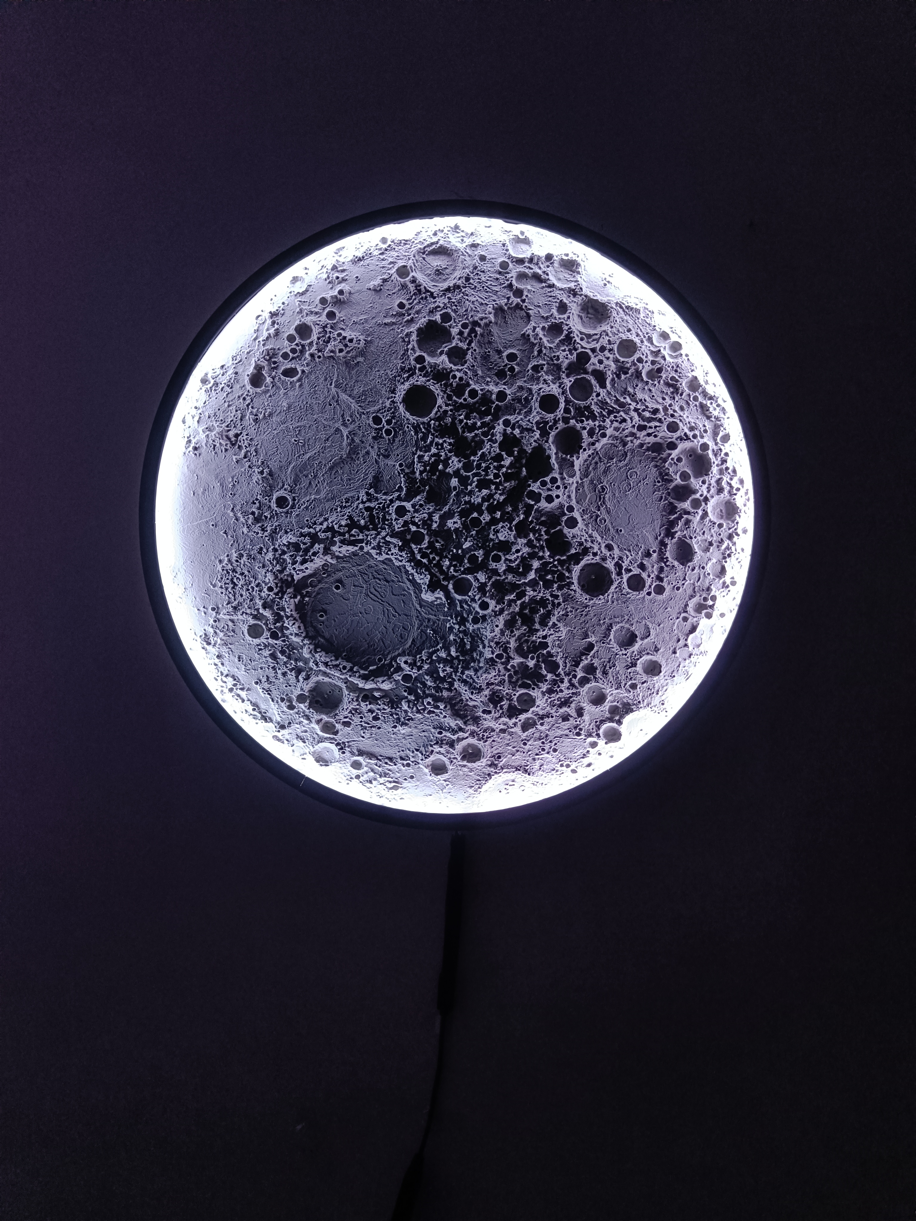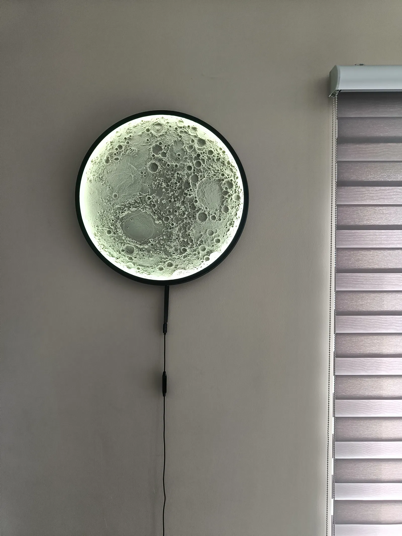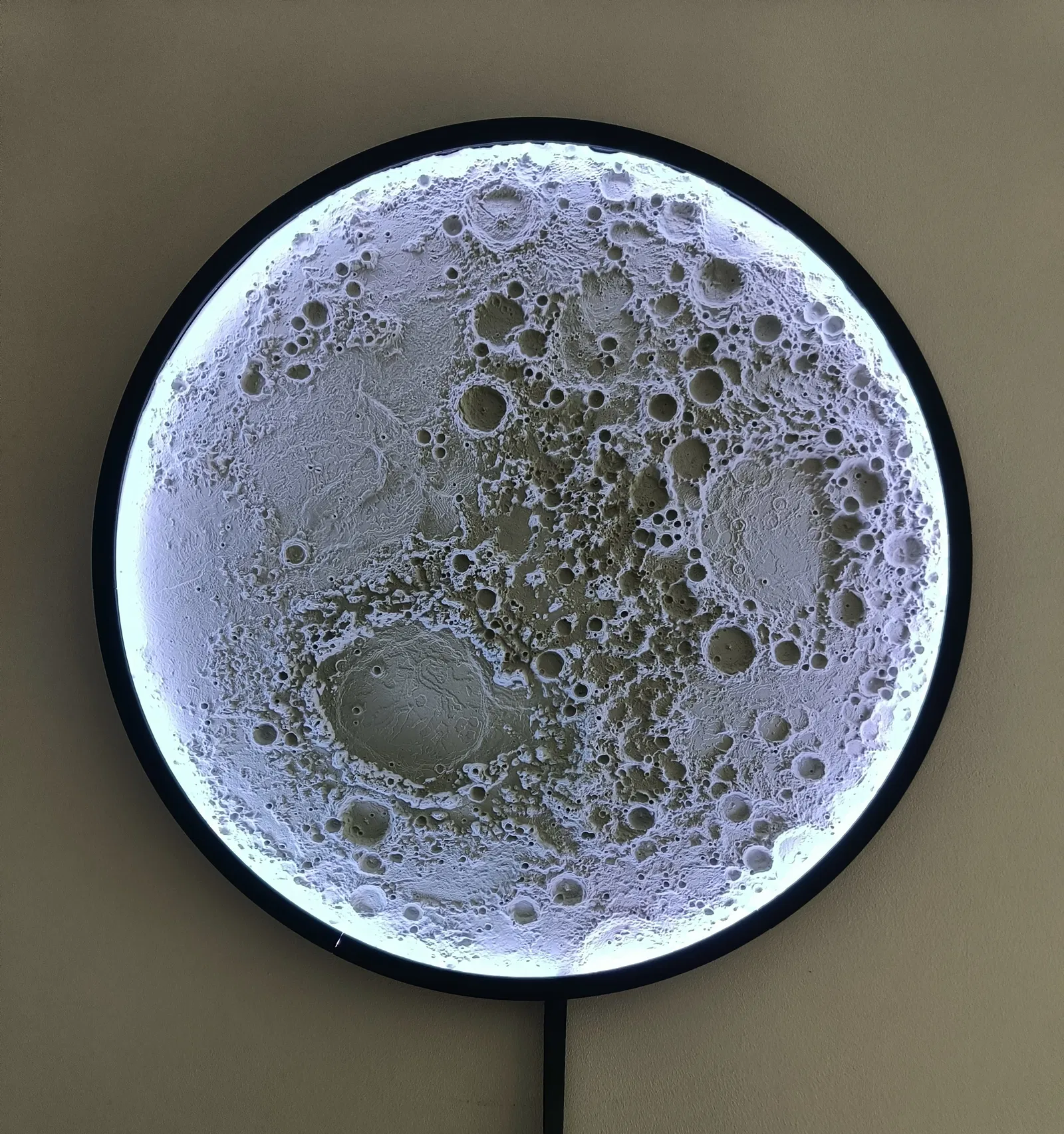 Một chiếc đèn treo tường Mặt Trăng có chiếu sáng, đường kính gần nửa mét, được làm từ dữ liệu Mặt Trăng thực tế. Thiết kế được chia thành bốn phần, dễ dàng in ấn và lắp ráp, tạo điểm nhấn trang trí độc đáo cho không gian.
