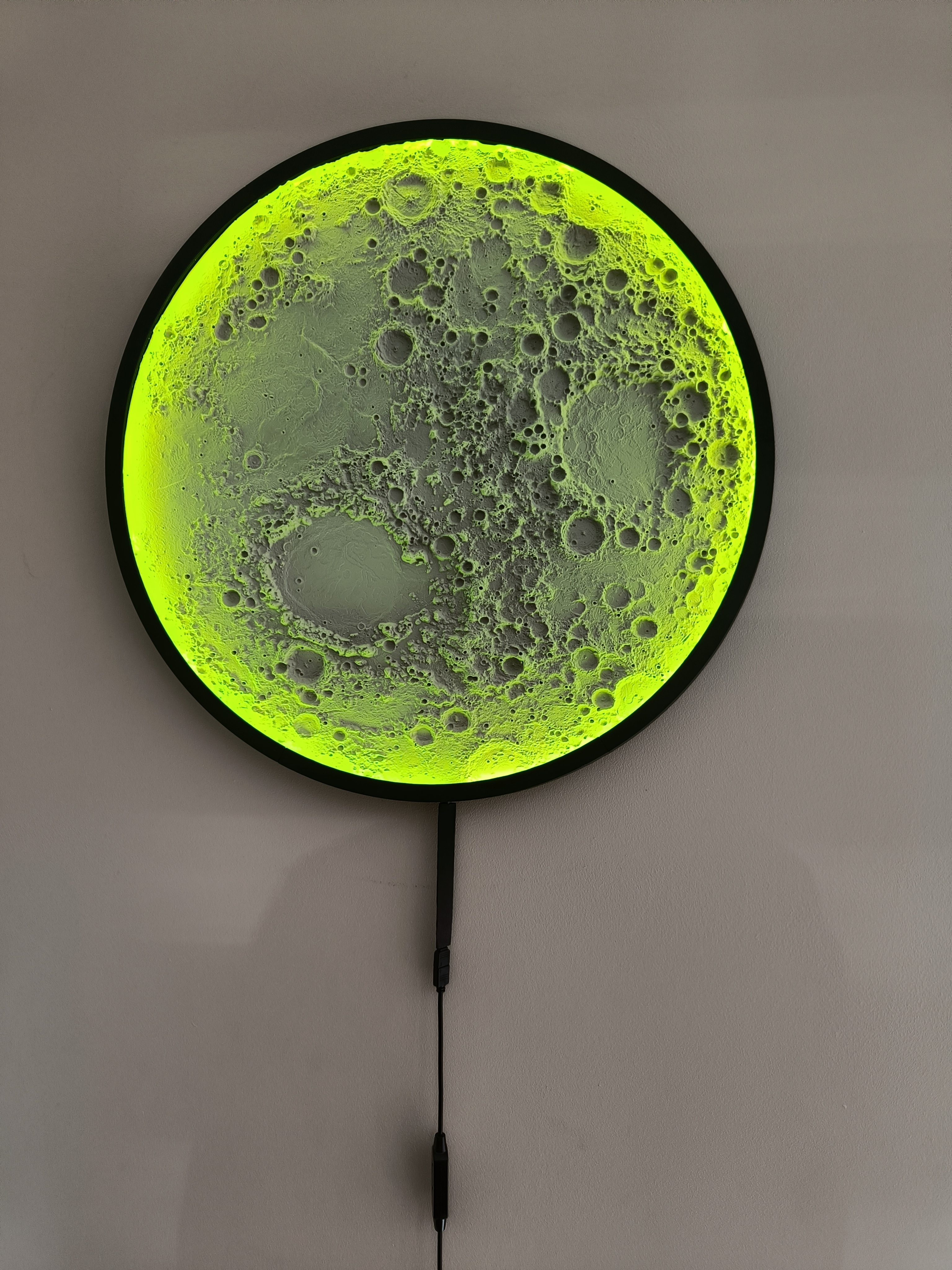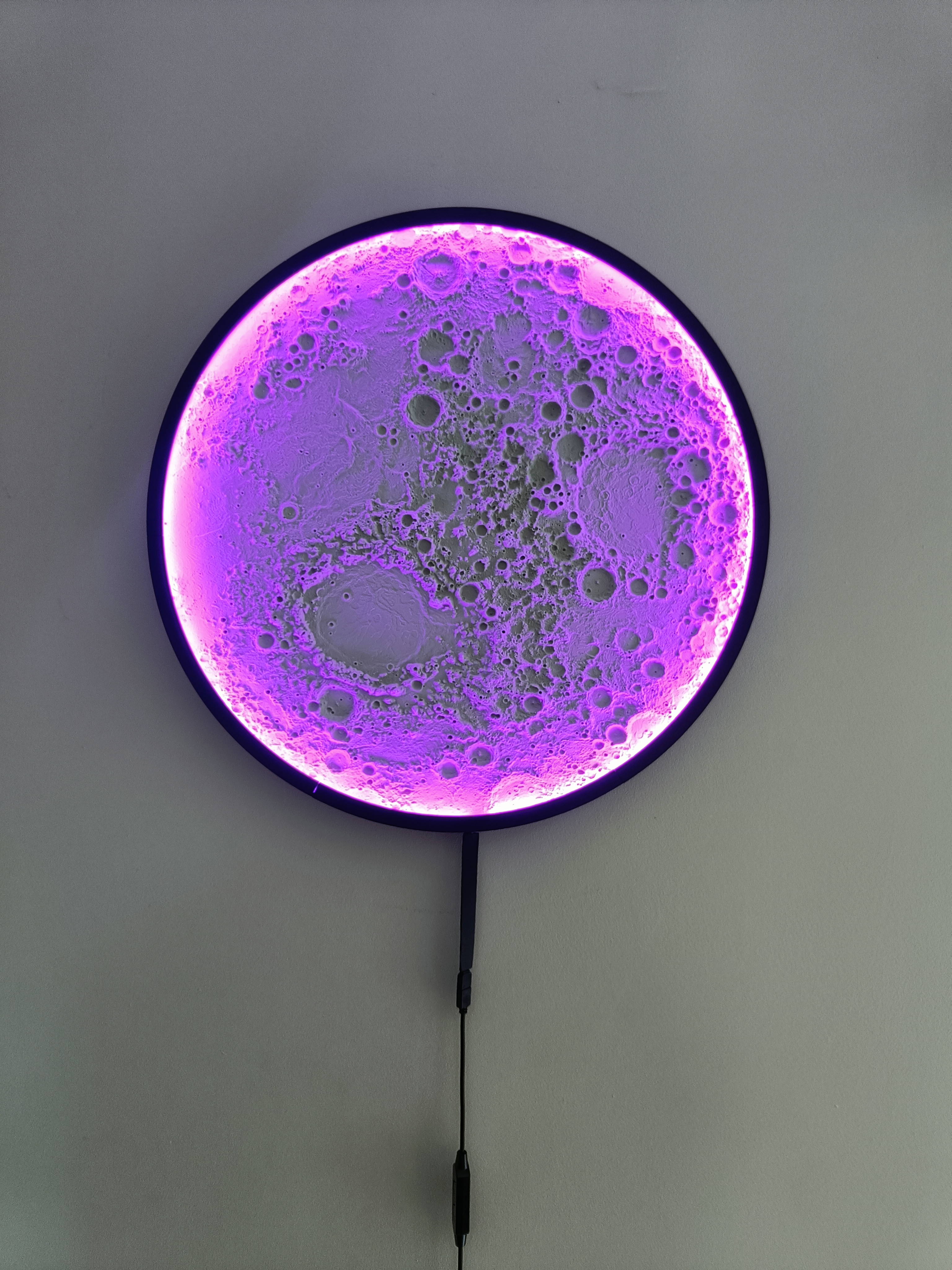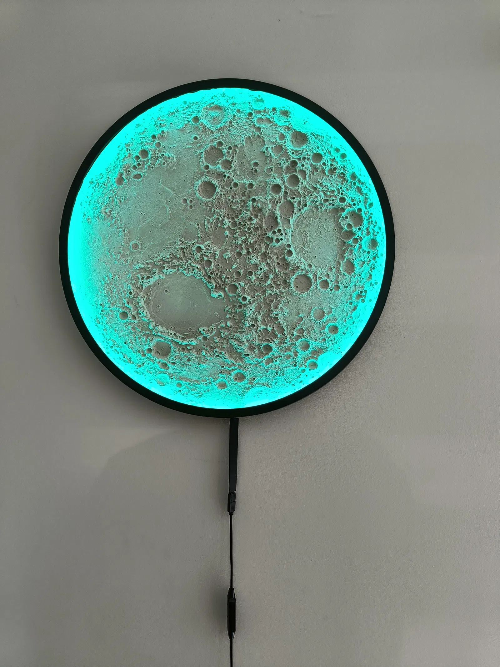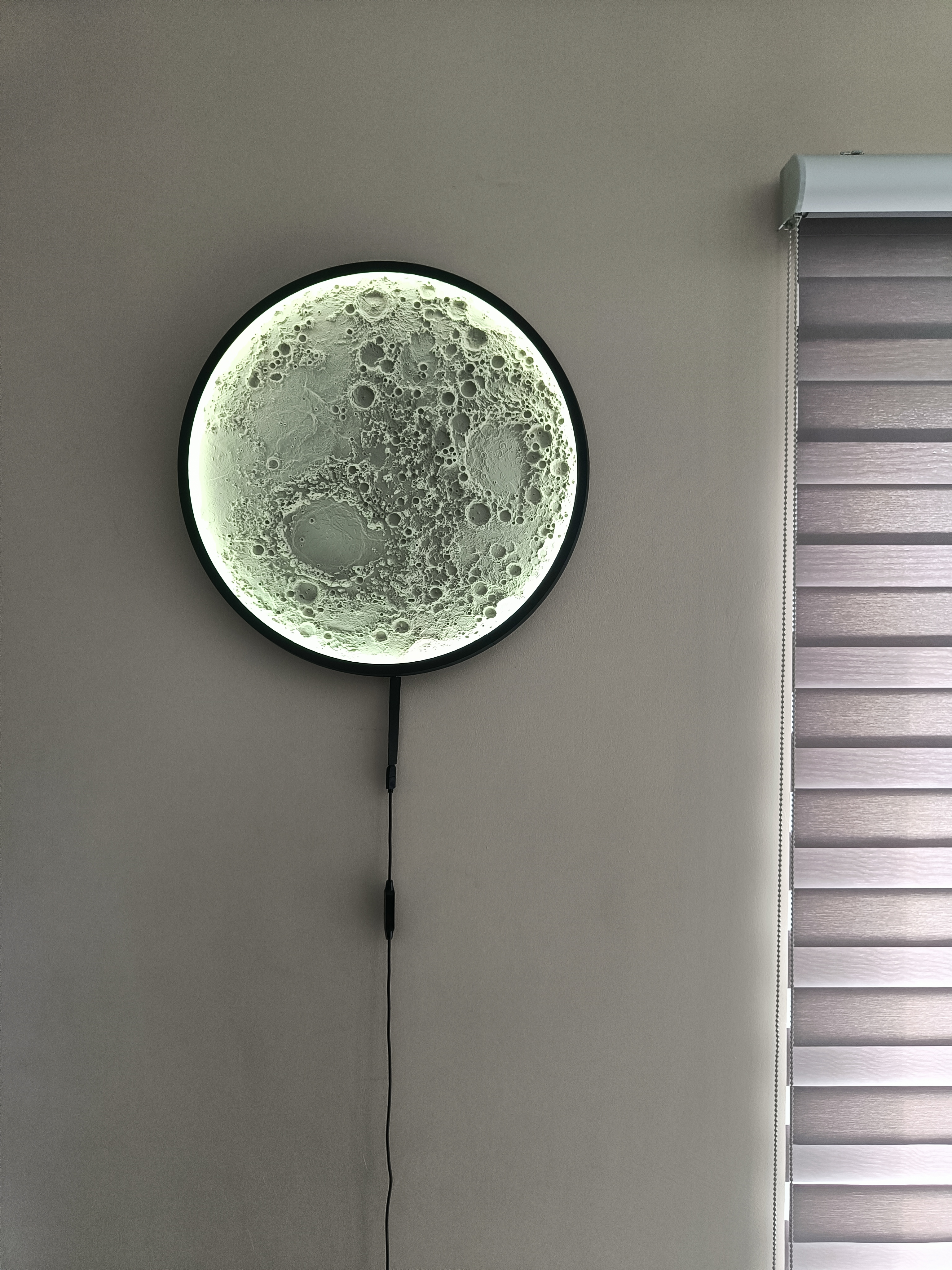 Một chiếc đèn treo tường Mặt Trăng có chiếu sáng, đường kính gần nửa mét, được làm từ dữ liệu Mặt Trăng thực tế. Thiết kế được chia thành bốn phần, dễ dàng in ấn và lắp ráp, tạo điểm nhấn trang trí độc đáo cho không gian.