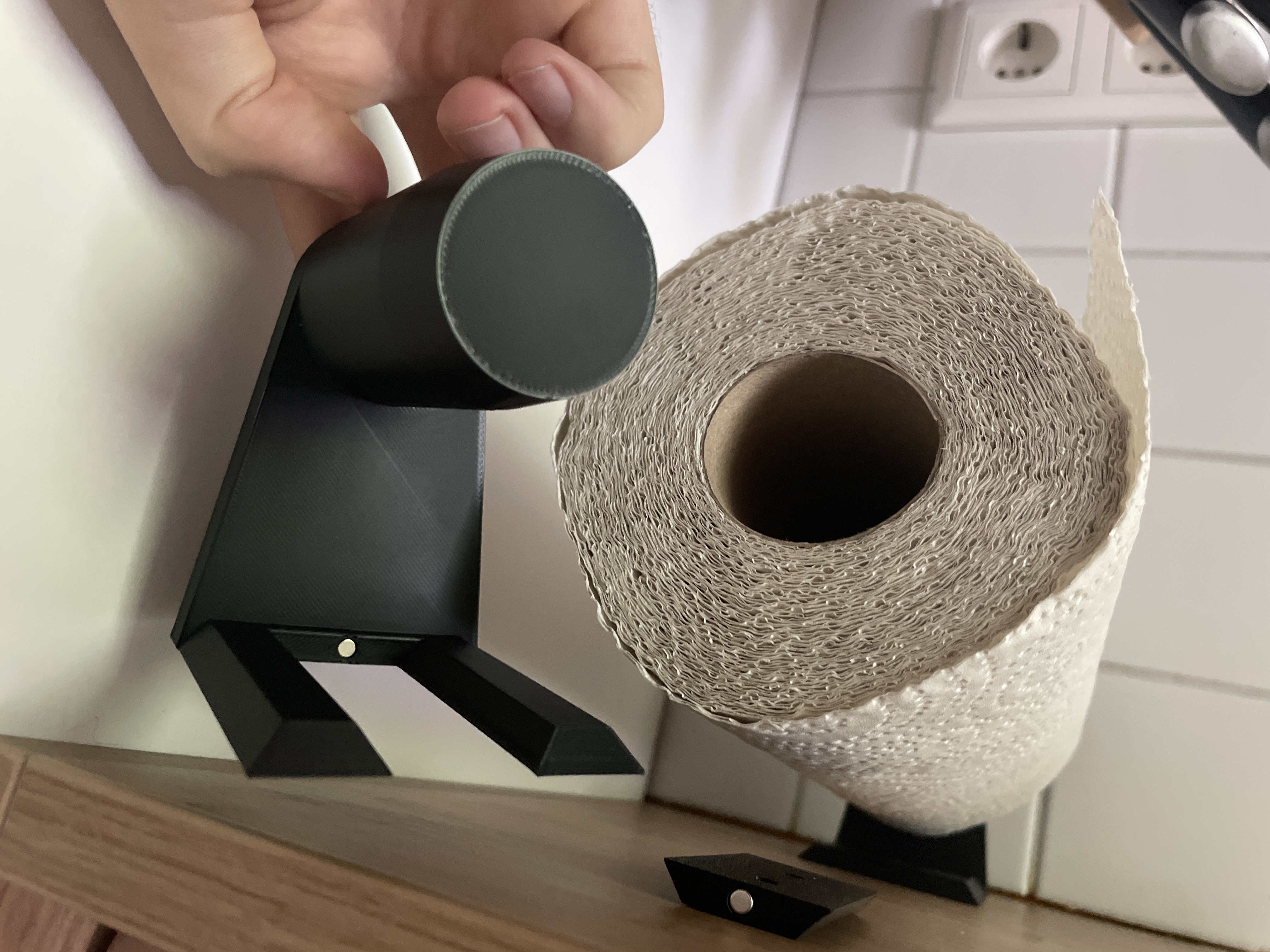 Giá đỡ giấy cuộn nhà bếp dạng parametric, có cơ chế nam châm để thay đổi cuộn giấy nhanh chóng. Bạn có thể cần điều chỉnh dung sai cho chi tiết cố định tùy theo độ chính xác máy in. Thay đổi kích thước nam châm nếu cần bằng các biến `mgd`, `mgl`, `mz`.