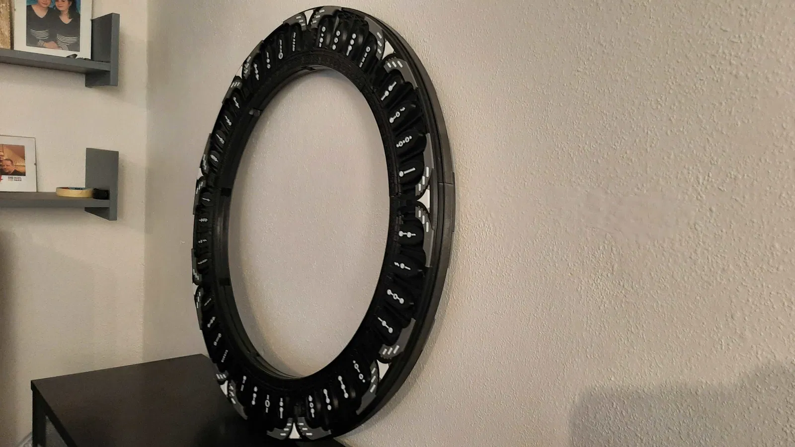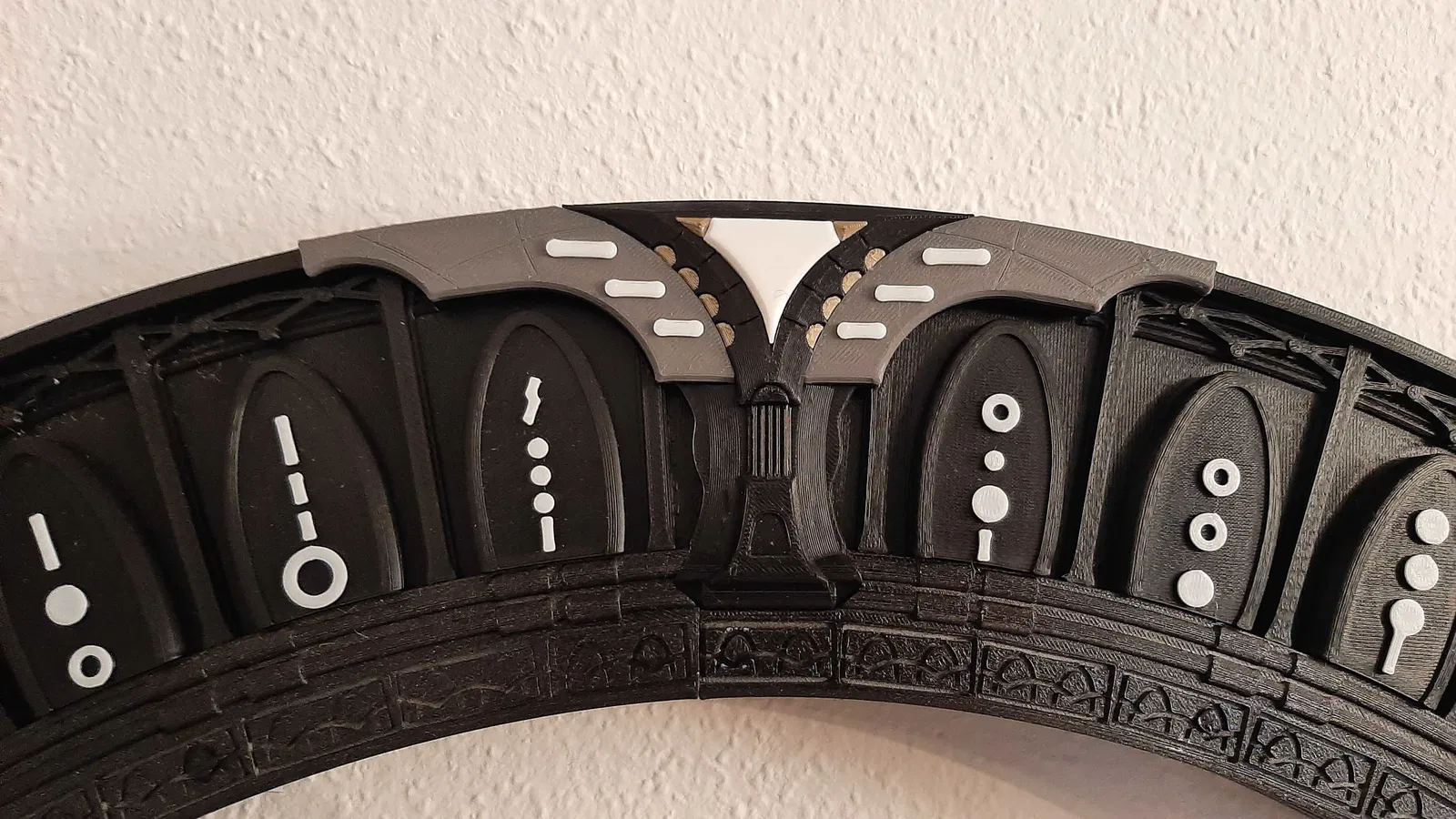 Đây là mô hình Cổng không gian (Stargate) theo phiên bản trong phim Stargate Universe - cổng loại Destiny. Mô hình này được thiết kế để treo tường giống như mô hình 80cm trước đây của tôi. Mô hình đã được chuẩn bị sẵn chỗ đi dây cáp và các chi tiết trung tâm màu trắng của các khóa cổng (chevron) được tách rời để có thể gắn đèn.