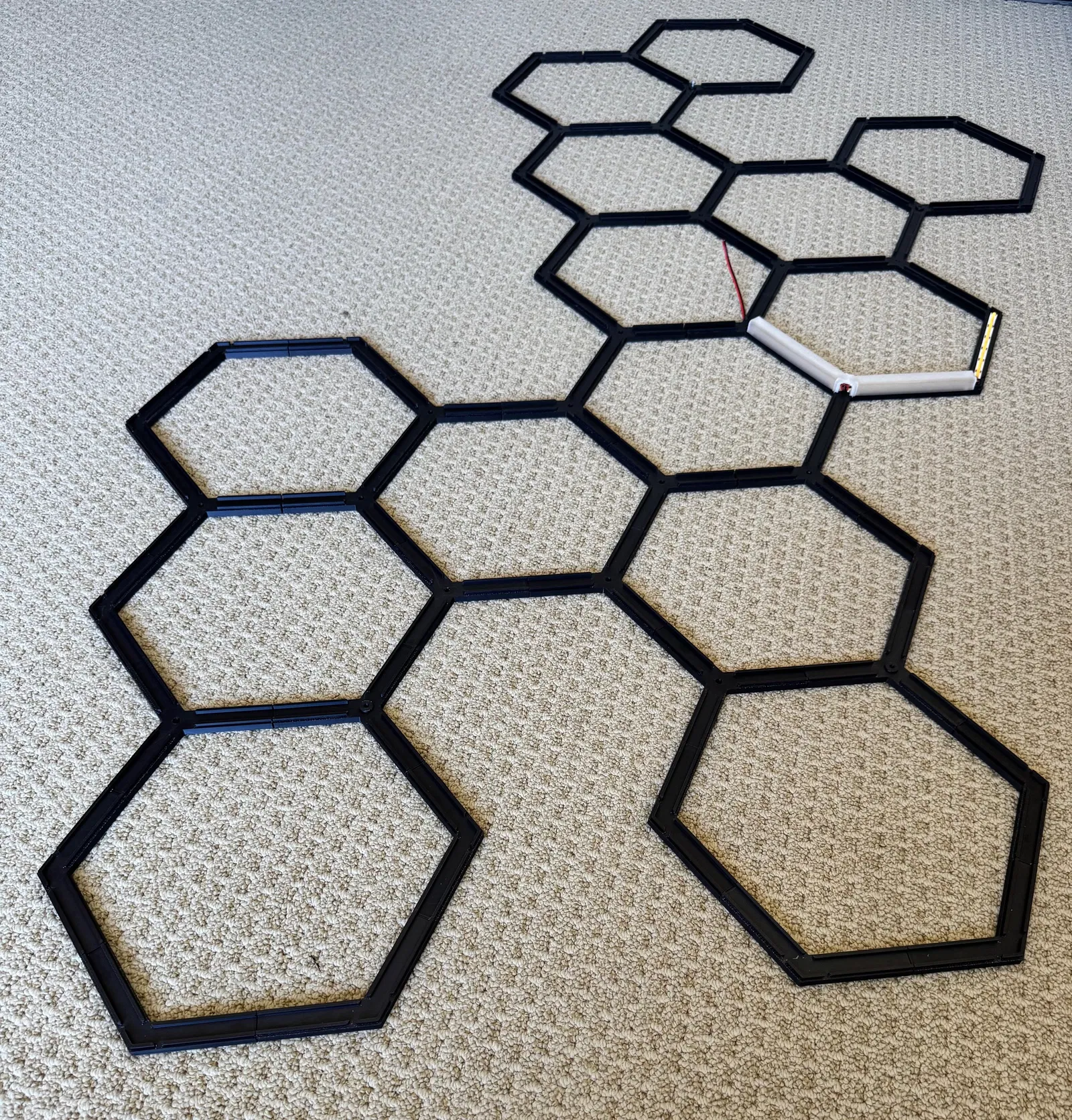 Tôi muốn tạo ra một chiếc đèn hình lục giác cho nhà để xe của mình, có thể cấu hình theo bất kỳ mẫu lục giác nào và có kích thước tùy ý, theo số lượng hình lục giác. Tôi đã tạo ra một mô hình mà khung chỉ bao gồm hai bộ phận chính, cộng với một đầu nối. Và bộ phận khuếch tán là một bộ phận chính bao phủ mặt bên của hình lục giác, cộng với hai loại khớp nối khác nhau cho các đỉnh khác nhau.