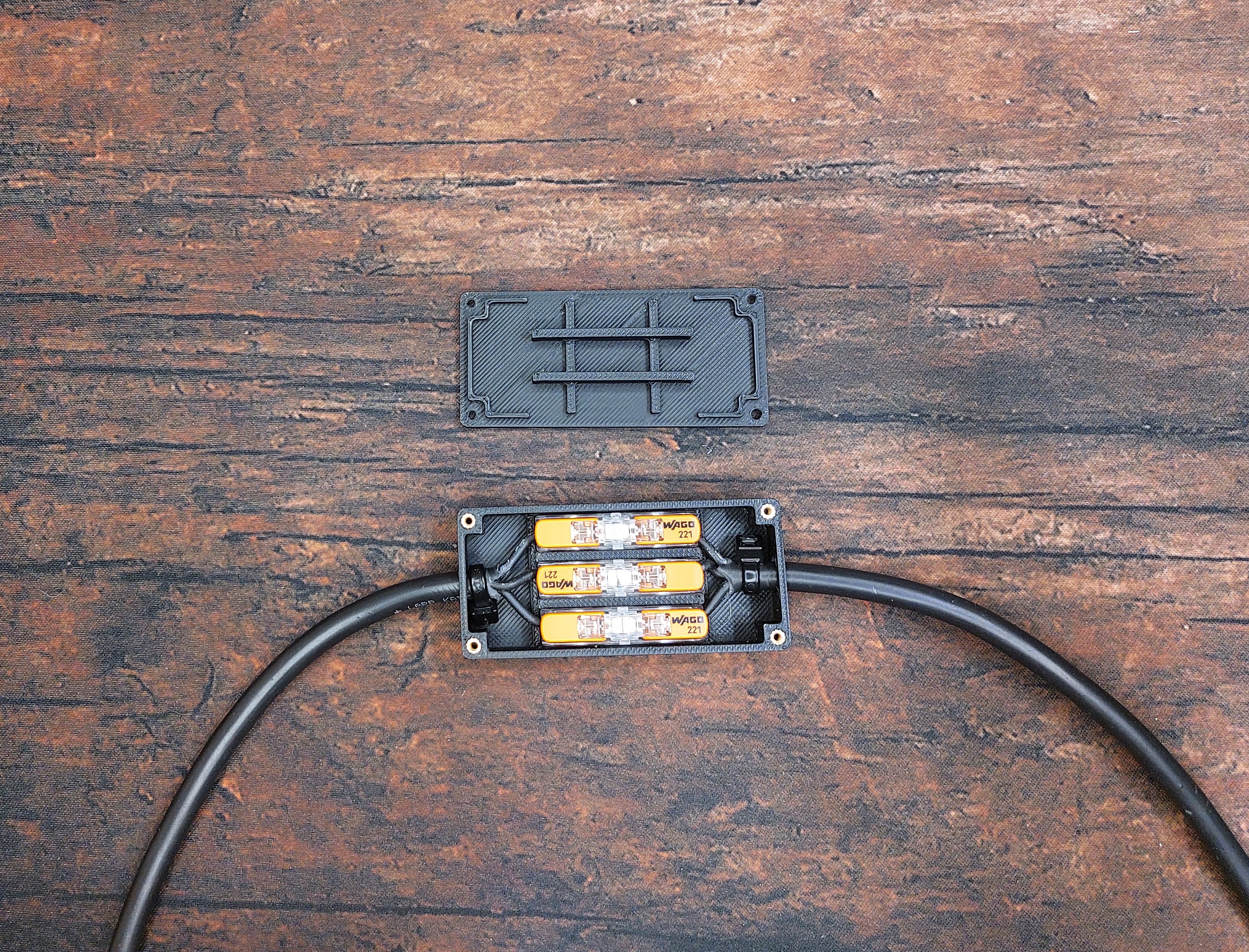Hộp nối WAGO 3 nhánh. Thích hợp cho cáp 3 ruột với tiết diện tối đa 1 mm². Nắp được gắn vào hộp bằng bốn chấu giữ nhiệt với ren M2. Vít cần dùng tua vít có đầu 5 mm.