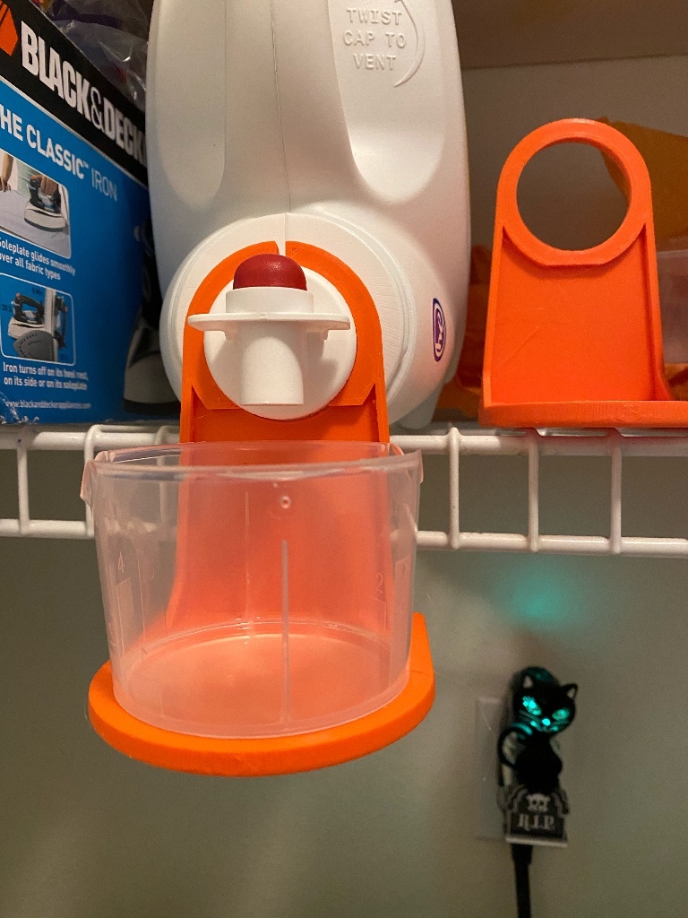 Đã chỉnh sửa để loại bỏ phần chân chó nhằm tiết kiệm vật liệu, tăng kích thước "kệ" để vừa khít cốc với bình Tide 150 fl oz, và tạo một khe nứt mỏng ở trên cùng của vòng treo để phù hợp với sự khác biệt nhỏ về kích thước giữa các nhãn hiệu.