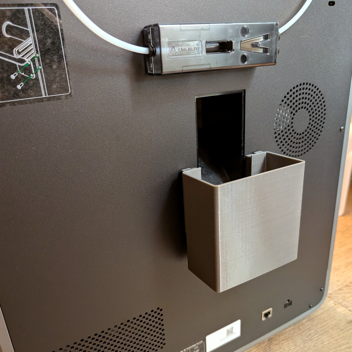 Cái thùng rác / xô đựng phân có thể tháo rời cho máy in K2 (260x260mm) và K2 Pro (300x300mm) mới của Creality. Anh em có thể bắt cái đế giữ lại bằng ốc zin của máy rồi trượt cái thùng ra vô dễ dàng để đổ rác.
