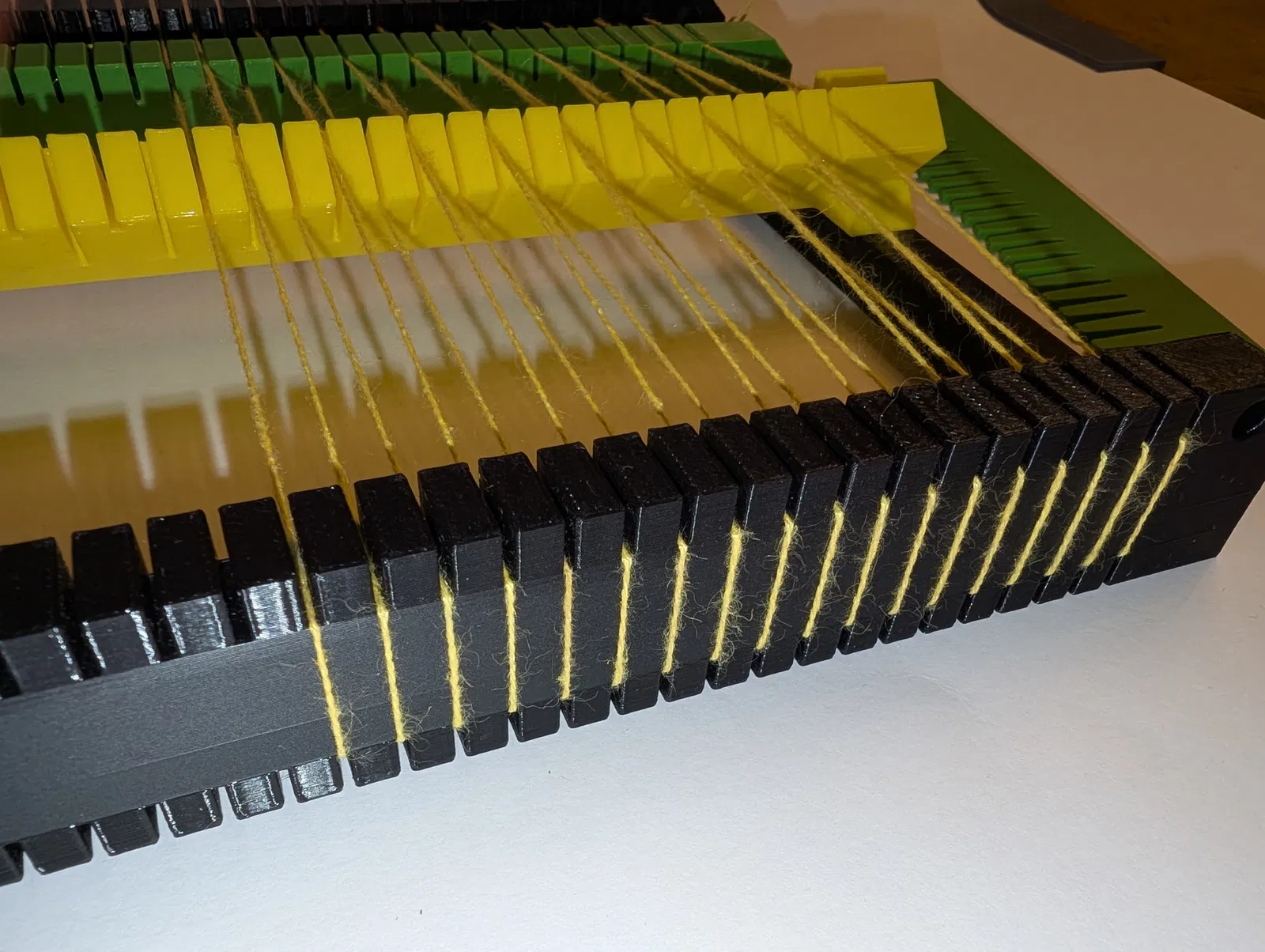 Trên khung dệt, bạn có thể luồn sợi dọc xuống dưới và vòng quanh (xem hình) để sợi dọc dài ra, dễ cắt và buộc hơn. Mình thì không làm vậy nên sợi dọc hơi ngắn, khó buộc.