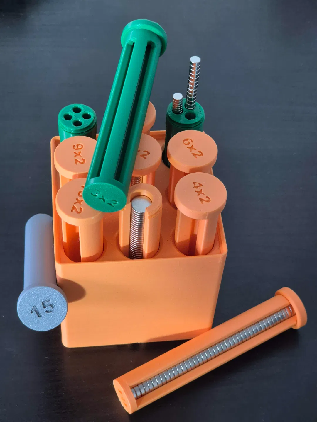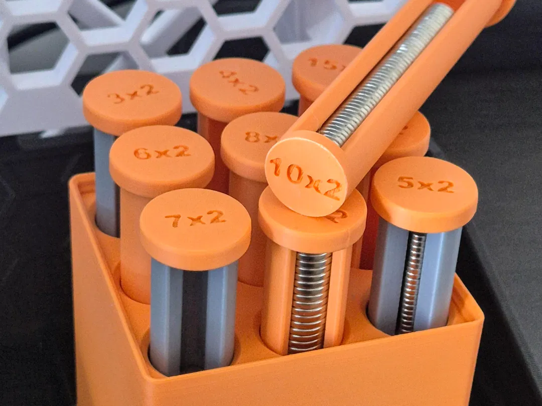 Cái này là giải pháp lưu trữ nam châm tối ưu nhất, tương thích với Gridfinity luôn nha. Bao gồm các ống và nắp vặn ren cho nam châm từ 1-15mm, ngoài ra còn có thể dùng để trữ vòng đệm (washer) hay… nút áo nữa đó hả?! 😄