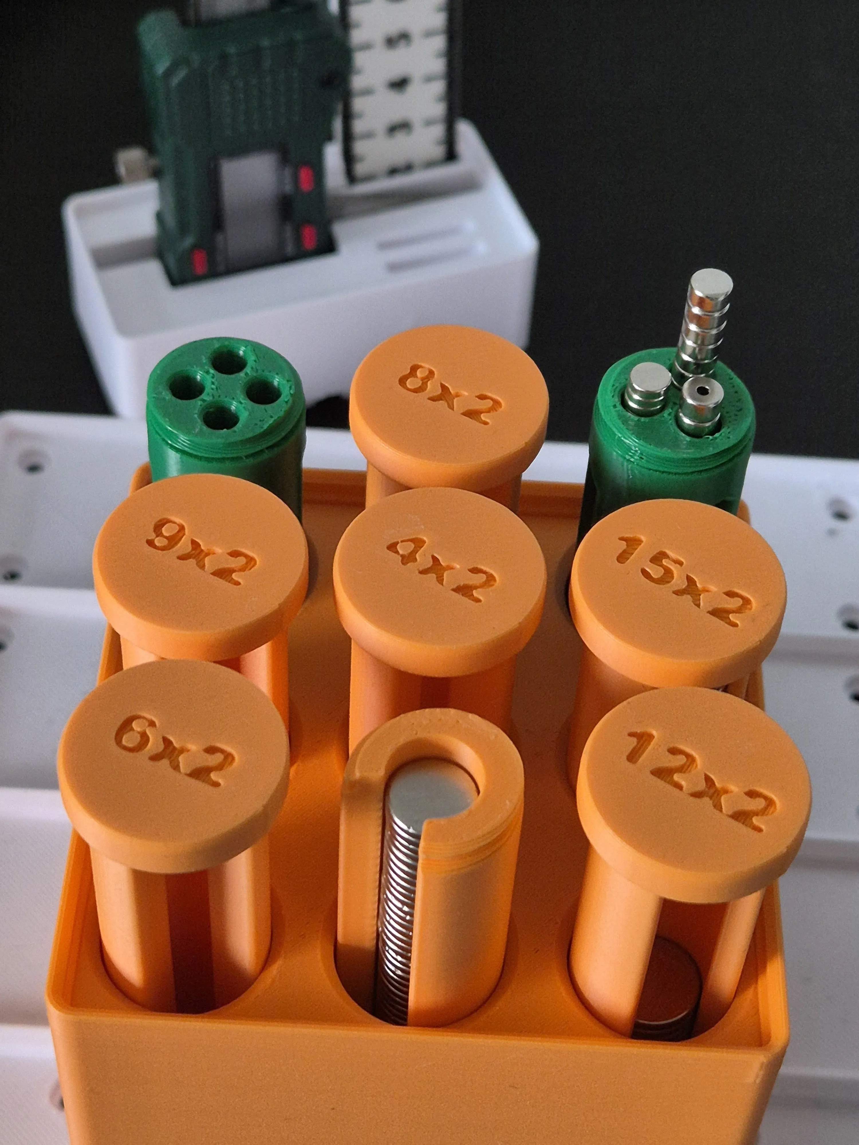 Ống + Nắp Trống cho phép bạn tự thêm kích thước trong slicer hoặc dùng bút lông ghi lên. Cái này hay lắm nếu nam châm của bạn không đúng kích thước chuẩn hoặc bạn muốn trữ mấy thứ khác như pin/vòng đệm v.v.