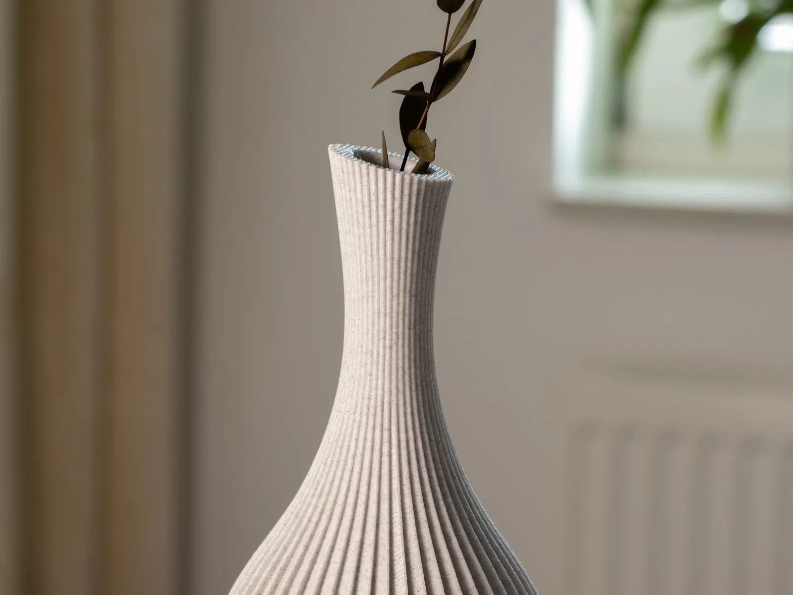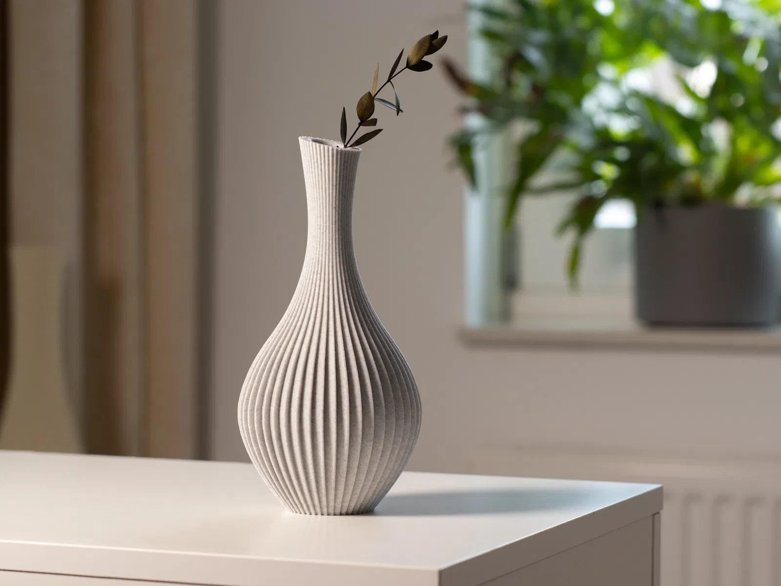 Bình hoa NINA sở hữu dáng vẻ thanh lịch với hoa văn đường kẻ bất đối xứng tinh tế, mang nét đẹp vượt thời gian và phù hợp đặt trên bàn hay kệ. Miệng bình hẹp lý tưởng cho hoa khô hoặc cành bạch đàn, mang lại sự tĩnh lặng và tinh tế cho nội thất.