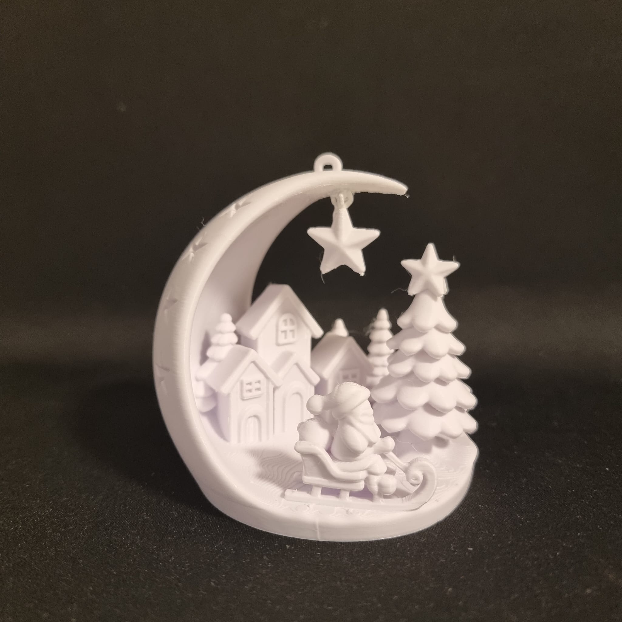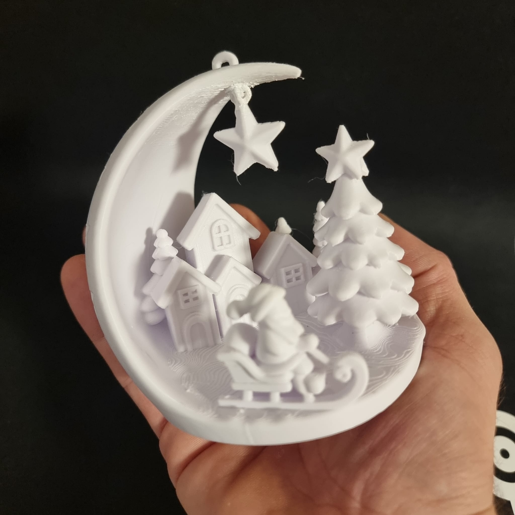 Bản in 3D này khắc họa một ngôi làng mùa đông ấm cúng với những ngôi nhà phủ tuyết, cây thông với những ngôi sao trên đỉnh và Ông Già Noel đang cưỡi xe trượt tuyết dưới ánh trăng lưỡi liềm. Ngôi sao treo càng làm tăng thêm vẻ duyên dáng, làm cho nó trở nên hoàn hảo để treo trên cây thông, lò sưởi hoặc là một phần của trưng bày ngày lễ.
