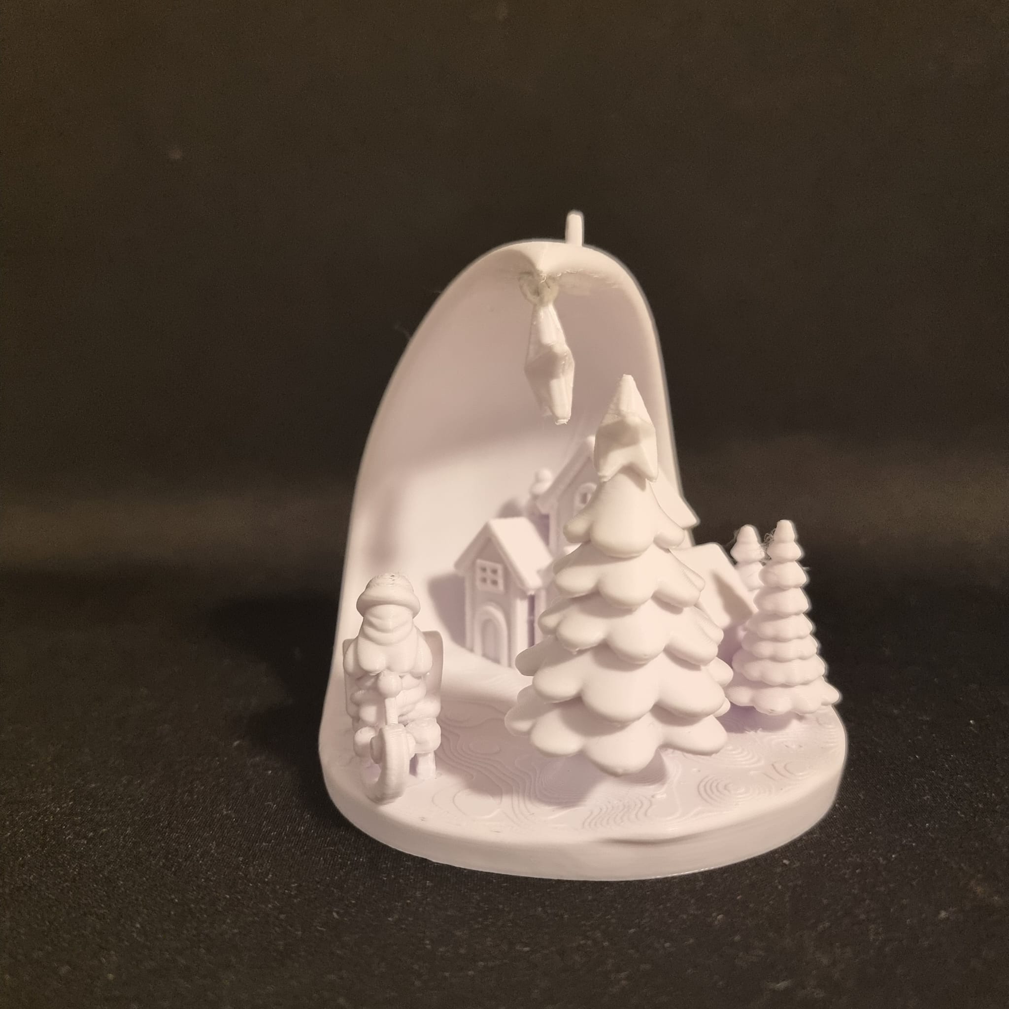 Mang không khí lễ hội ấm áp về nhà bạn với vật trang trí cây thông Noel chi tiết này! Bản in 3D khắc họa ngôi làng mùa đông ấm cúng với nhà cửa, cây thông và Ông Già Noel trên xe trượt tuyết dưới ánh trăng. Hoàn hảo để trang trí cây thông, lò sưởi hoặc trưng bày ngày lễ.
