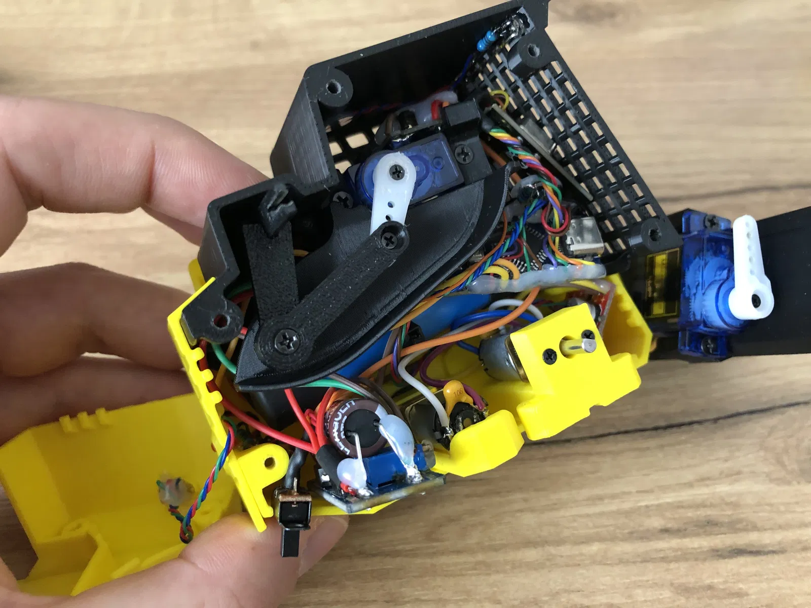 Tui làm cái máy xúc lật mini RC này cho vui thôi à. Toàn bộ cấu trúc là làm bằng PLA hết. Nó chạy bằng pin Li-ion 18650 đơn lẻ. Chỉ có ba loại ốc vít là giữ hết mọi thứ lại với nhau. Tui cũng có làm cái bộ điều khiển RC để điều khiển cái máy xúc lật RC này luôn, sắp tới sẽ có trên hồ sơ của tui nha.