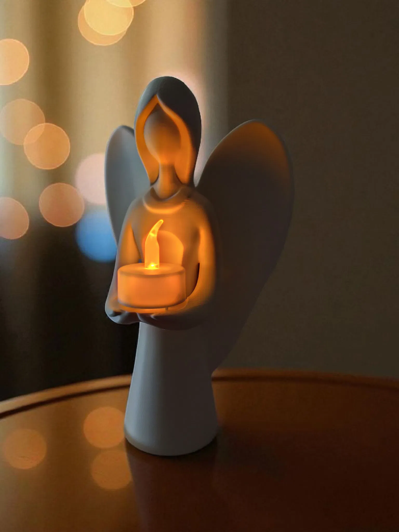 Một thiên thần Giáng Sinh tối giản, vượt thời gian giữ ngọn nến LED. Kích thước 220x140x104 mm, chứa nến LED 45mm. Cài đặt in chi tiết. Giấy phép thương mại có thể có qua Patreon.