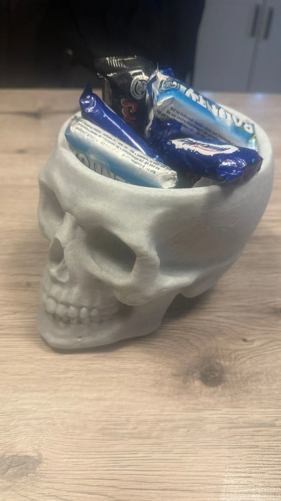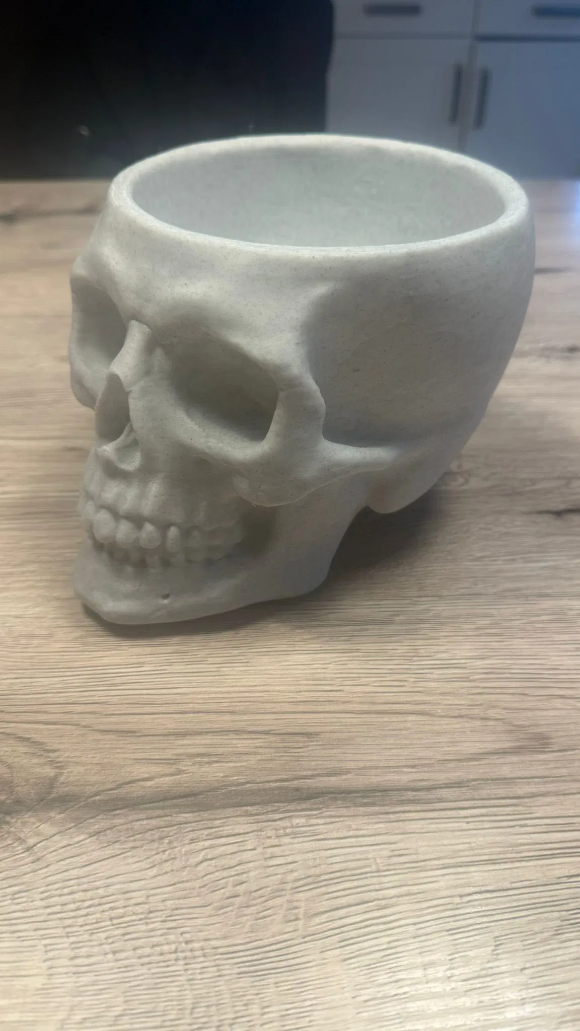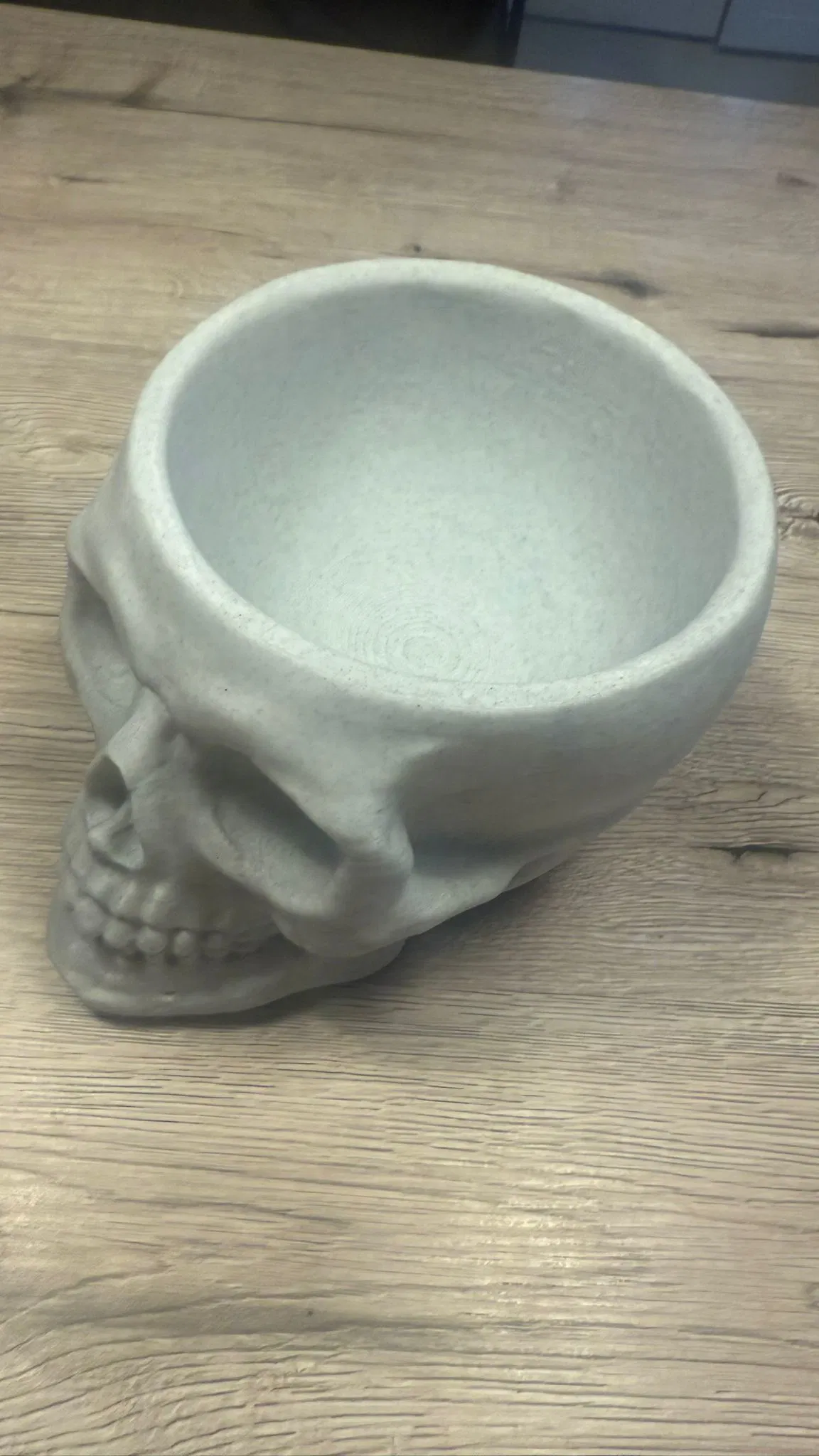 Tui có làm cái tô hình đầu lâu này và in bằng sợi filament giả đá cẩm thạch. Tui đã scale nó lên kích thước ngoài 20cm, đựng được kha khá đồ cho mấy đứa nhỏ luôn đó. Tui in bằng máy P1S với đầu phun 0.4. Có một cái trụ nhỏ phía sau dưới cái đầu để làm trụ đỡ.