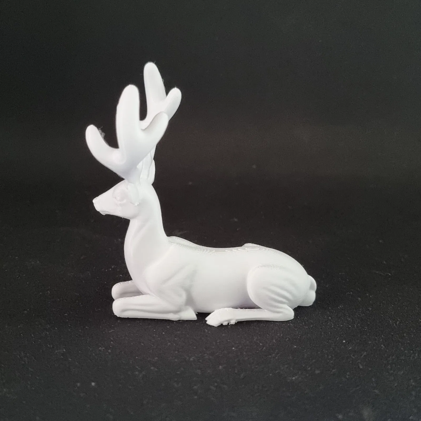 Một con nai đực (nai đực) ở tư thế ngồi, với chân trước và chân sau gập gọn dưới thân. Đặc điểm nổi bật nhất của nó là một bộ sừng lớn, thanh lịch, phân nhánh vươn cao và quét về phía sau.