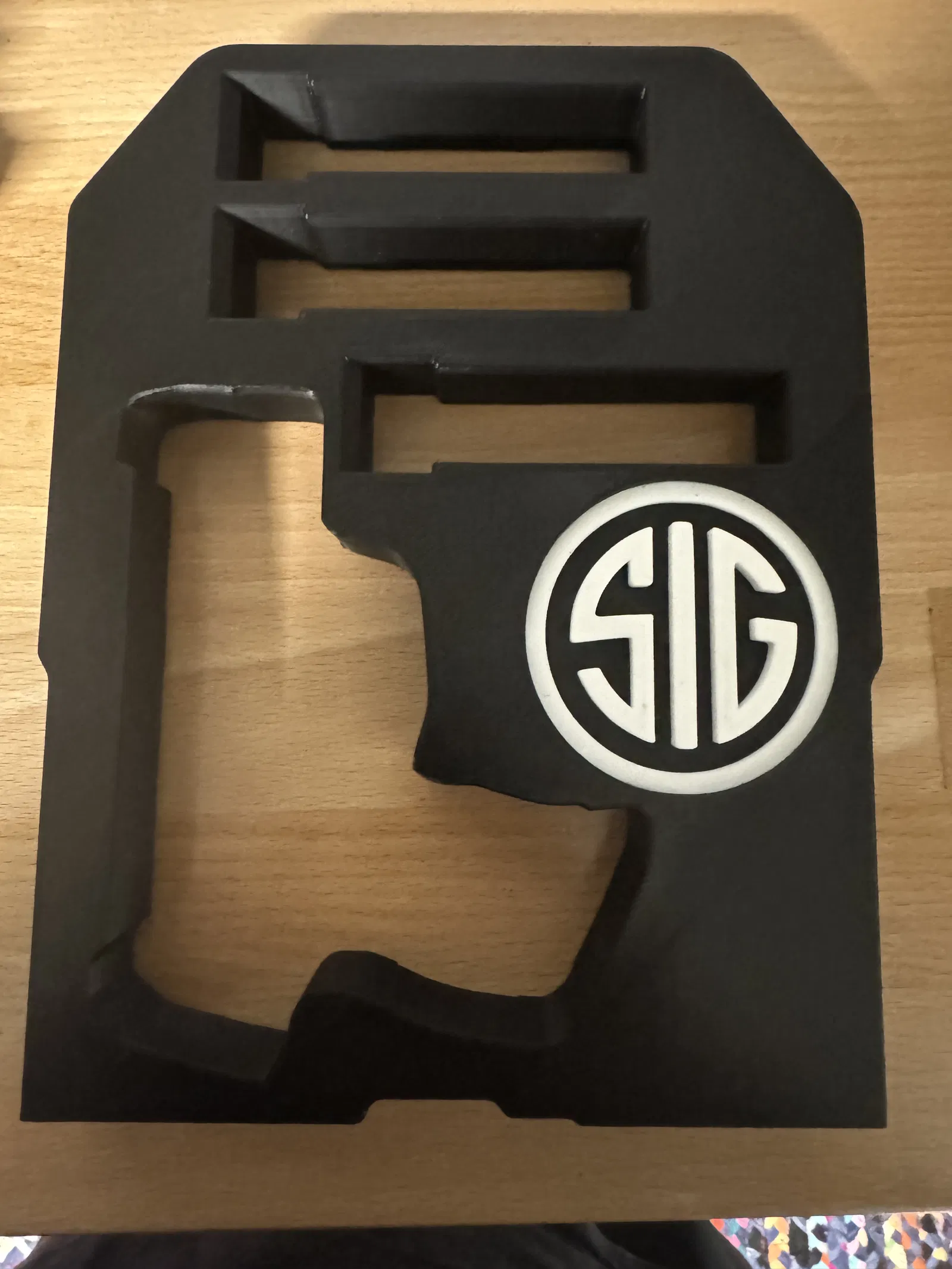 4-15-24: Có V2 mới nha, bo tròn hết các cạnh rồi. Thêm vát 45 độ ở chỗ để băng đạn để xài mấy cái băng đạn có extension á, với thêm cái logo SIG nữa nè. Phiên bản này chắc in ngửa mặt lên là đẹp nhất, có support nha, mặt trước sẽ mịn màng, còn mặt sau hơi nhám chút nhưng mà không ai thấy đâu. Mình test in thử rồi nha.