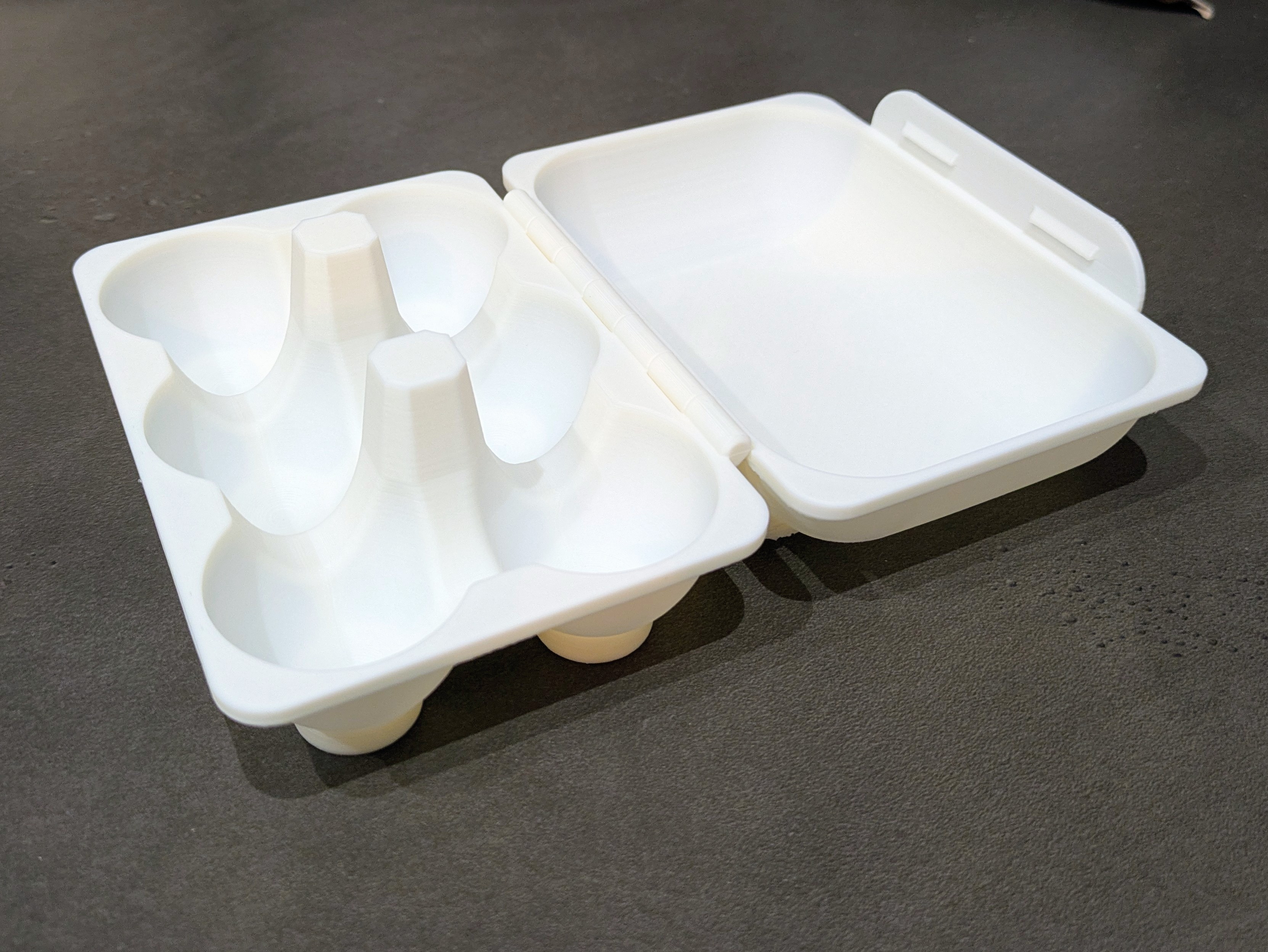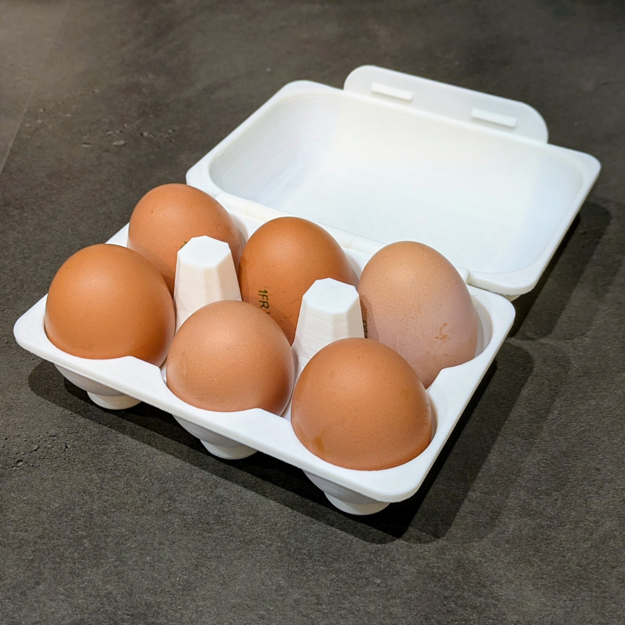 Hộp đựng trứng 6 quả đơn giản, có bản lề, đóng gài chắc chắn và có thể xếp chồng lên nhau. Đặc biệt, bạn có thể in cả hộp mà không cần lắp ráp. Thời gian in khoảng 10 tiếng, sử dụng vật liệu PLA và cần hỗ trợ khi in.