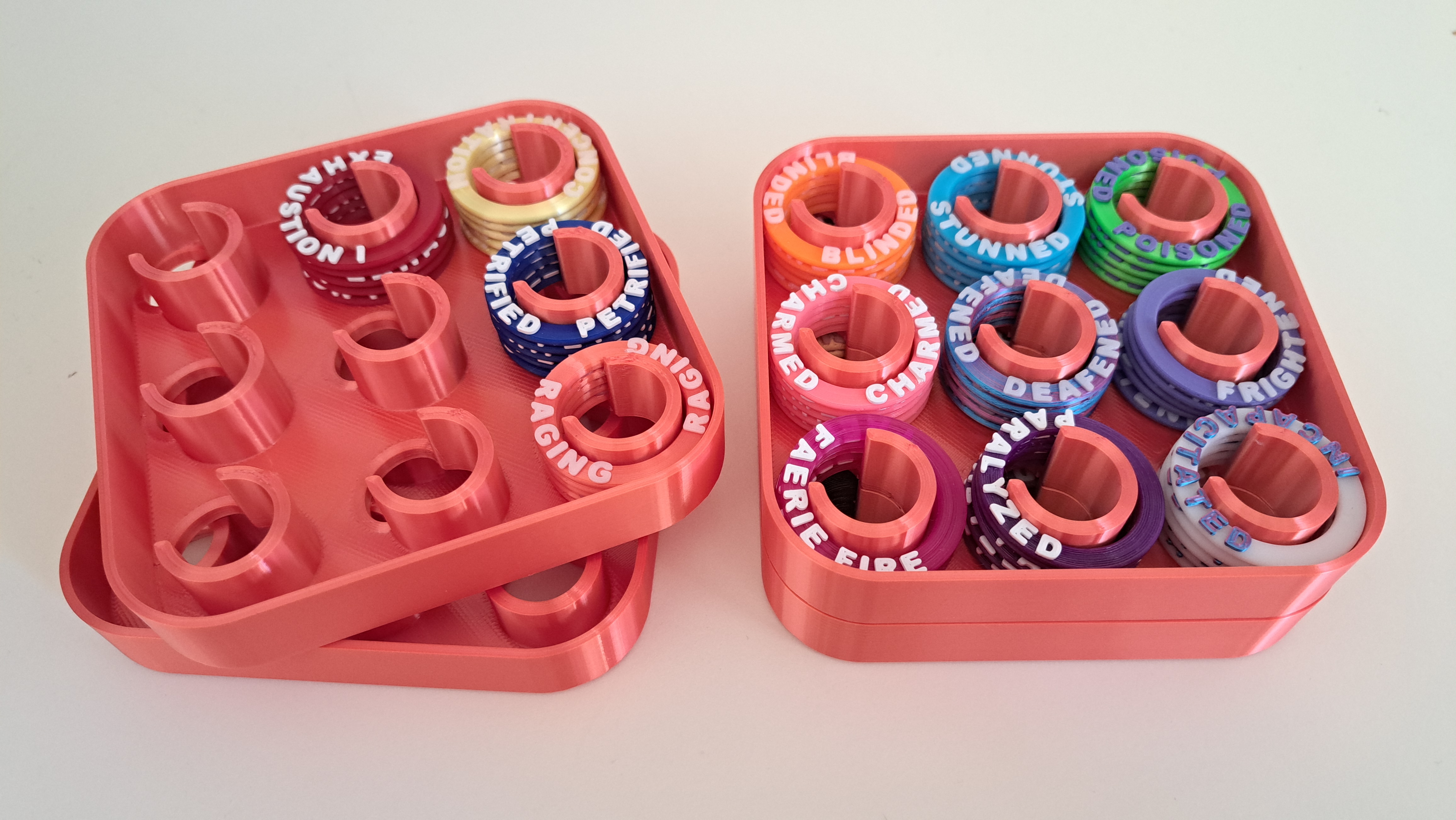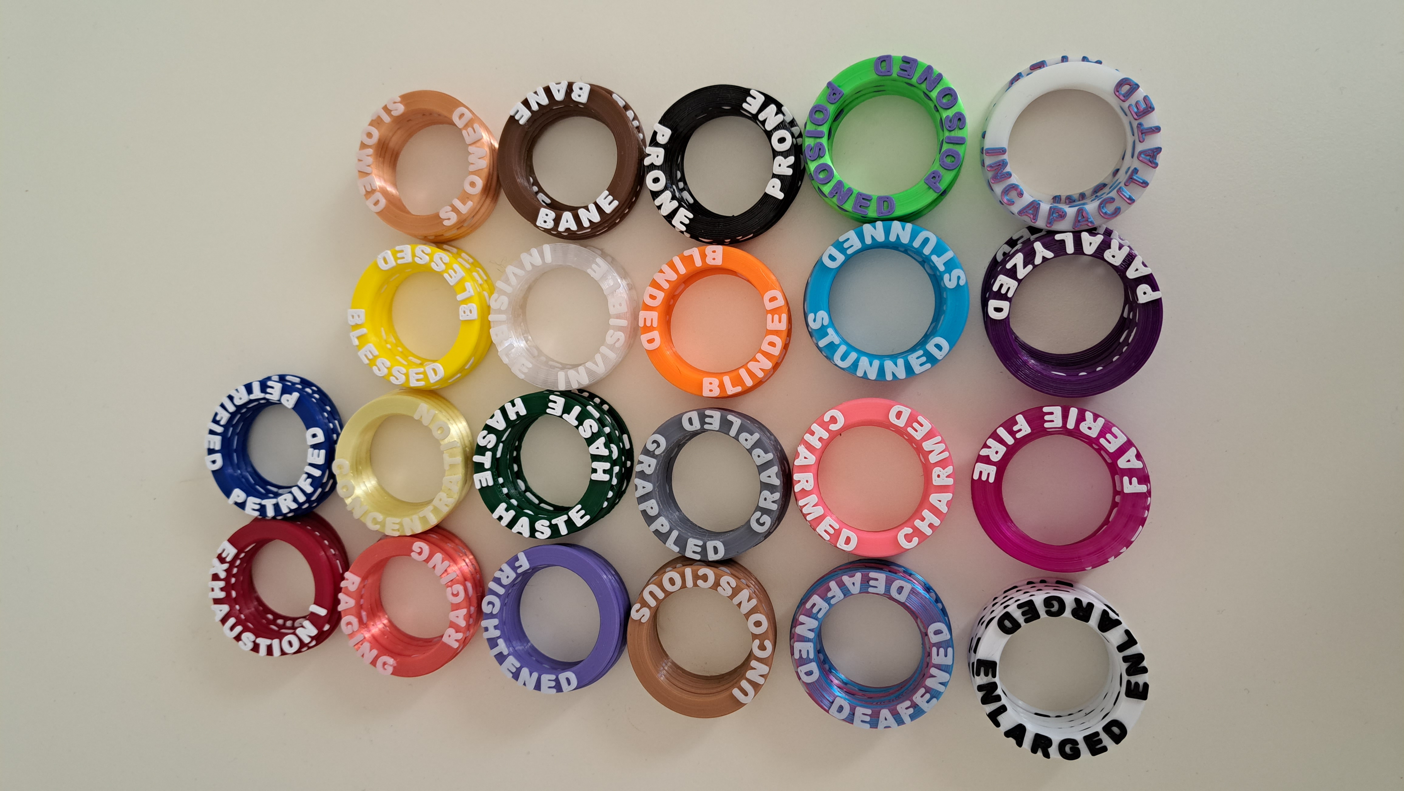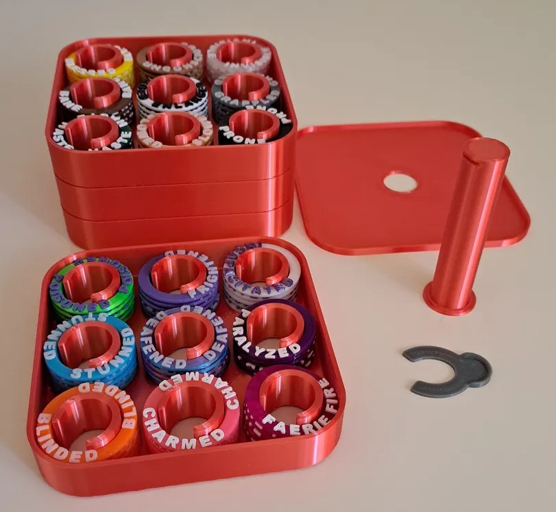 Khám phá bộ nhẫn trạng thái và hiệu ứng toàn diện cho D&D 5E và Pathfinder 2E. Bao gồm cả tùy chọn lưu trữ mô-đun, tối ưu hóa cho việc tìm kiếm và truy cập nhanh chóng. File nguồn STL và Step có sẵn để tùy chỉnh.