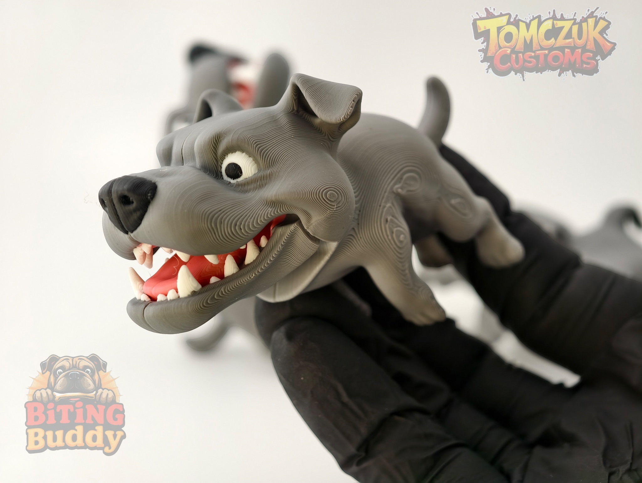Mẫu Biting PitBull Toy với hàm khớp động, gặm vui tay. In hai nửa, ráp bằng keo 502, có chốt định vị. Chân đế có sẵn, dễ tháo. Hỗ trợ AMS/đa sắc màu. Chỉnh lực cắn bằng scale/chất liệu.