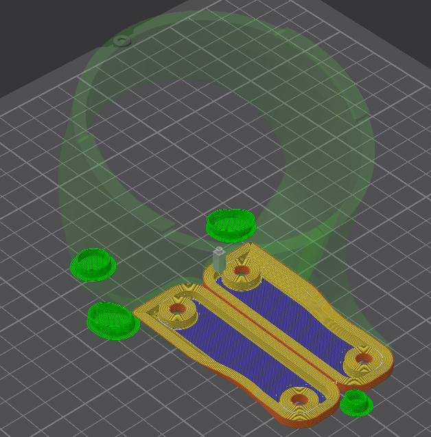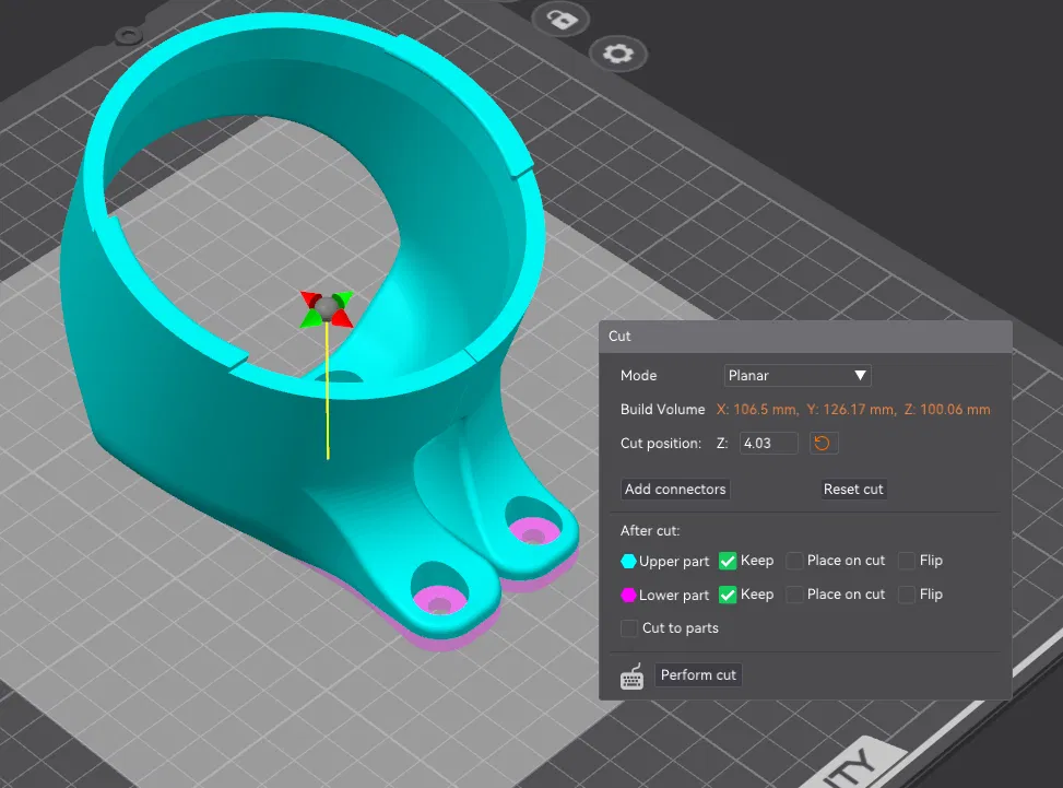 Tải vào slicer, đặt mặt bích úp xuống khay in và cắt vật thể ở độ cao 4.02mm so với mặt in và song song với mặt in. Căn chỉnh các vật thể sao cho chúng ở cùng vị trí.