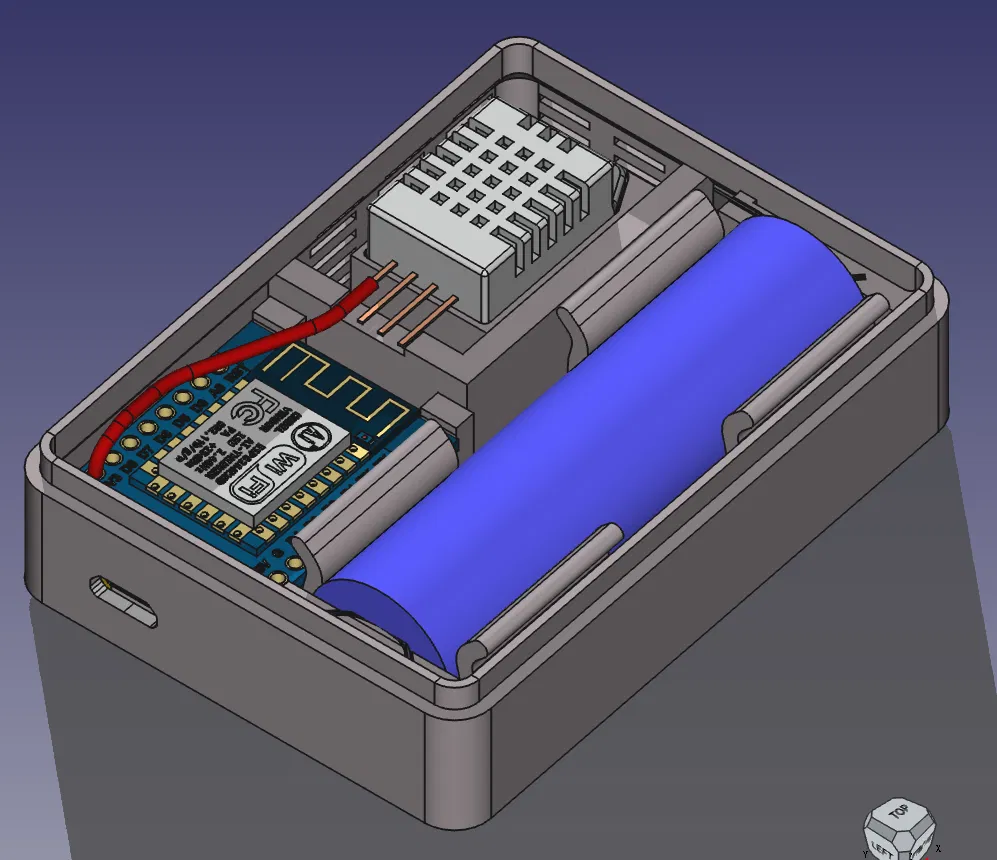 Vỏ cho hệ thống cảm biến độ ẩm với DHT22, Wemos D1 Mini, khay pin 18650 và module sạc. Có thiết kế tham số, cách ly nhiệt cho cảm biến và tai gắn tiện lợi. Dễ dàng lắp ráp với fuzzy skin và các file nguồn đi kèm.