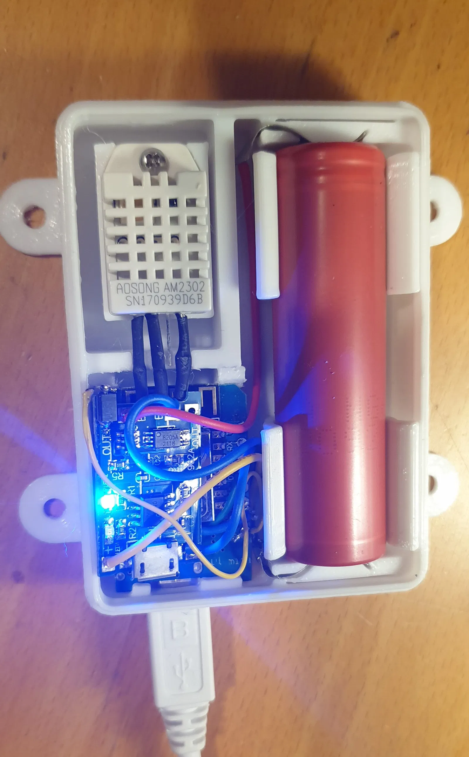 Cái vỏ cho hệ thống cảm biến độ ẩm gồm cảm biến DHT22, bo mạch Wemos D1 Mini, khay pin 18650 và module sạc pin.