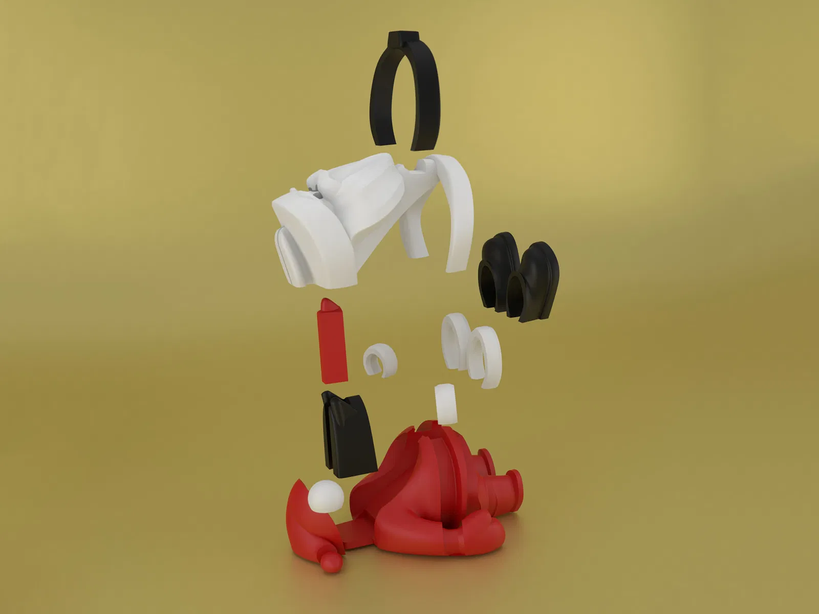 Mô hình mẫu có các màu sau: ĐEN: giày, mắt, thắt lưng ĐỎ: thân, mũ, mũi TRẮNG: vớ, tay áo, pompom, đầu