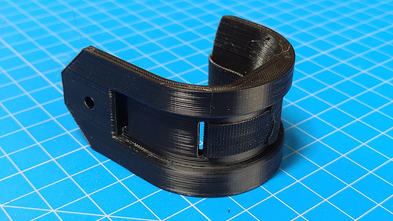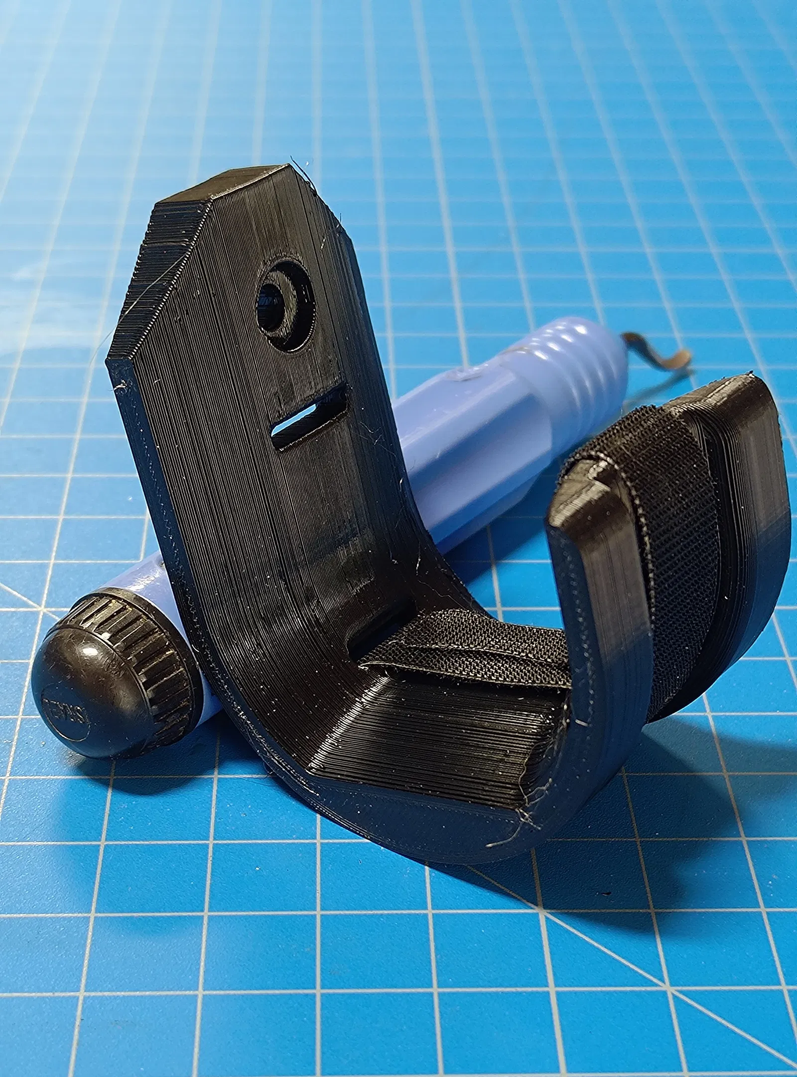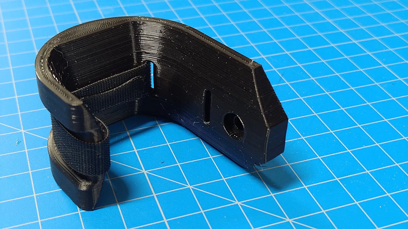 Một móc chữ J chuyên dùng để treo dây cáp, cho phép bạn dùng dây Velcro để cố định chúng. Phiên bản V2 có thể in mà không cần đế đỡ.