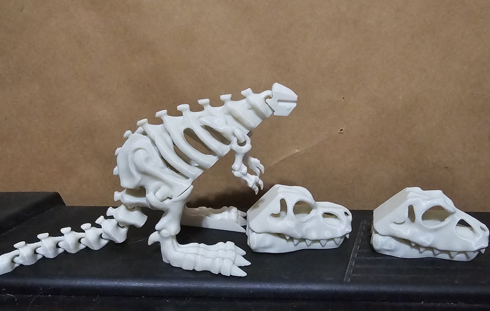 Bộ xương khủng long khớp nối có thể tháo rời hộp sọ. Bao gồm hai hộp sọ theo kiểu T-Rex và Allosaurus. Dễ in và không cần hỗ trợ. Không khuyến khích in nhỏ hơn kích thước mặc định.