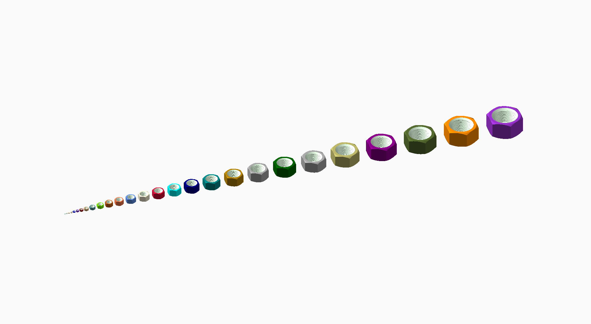 Bộ đầy đủ các loại đai ốc ren mịn Metric chuẩn ISO 261/262, từ M1 đến M64. Thiết kế ren cải tiến không cần tính dung sai máy in. Khuyến nghị in với độ dày lớp 0.15mm. Tìm ốc vít ren mịn tương ứng và bộ sưu tập phụ kiện khác.