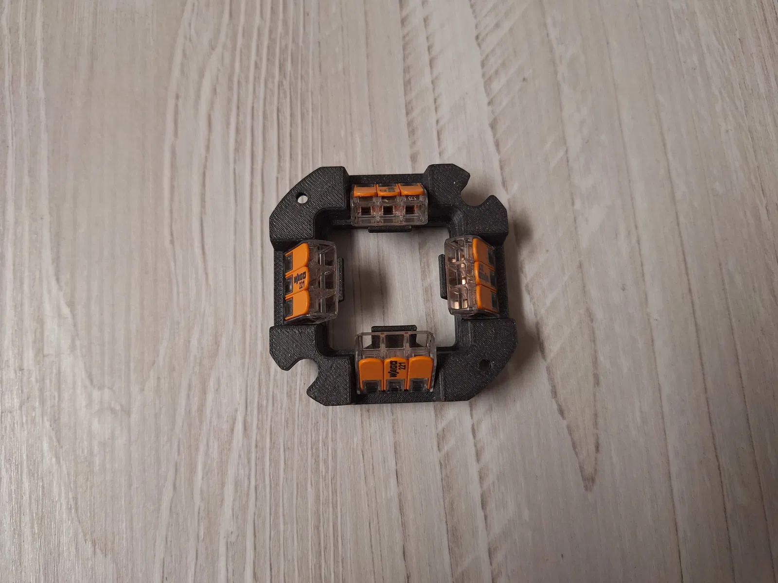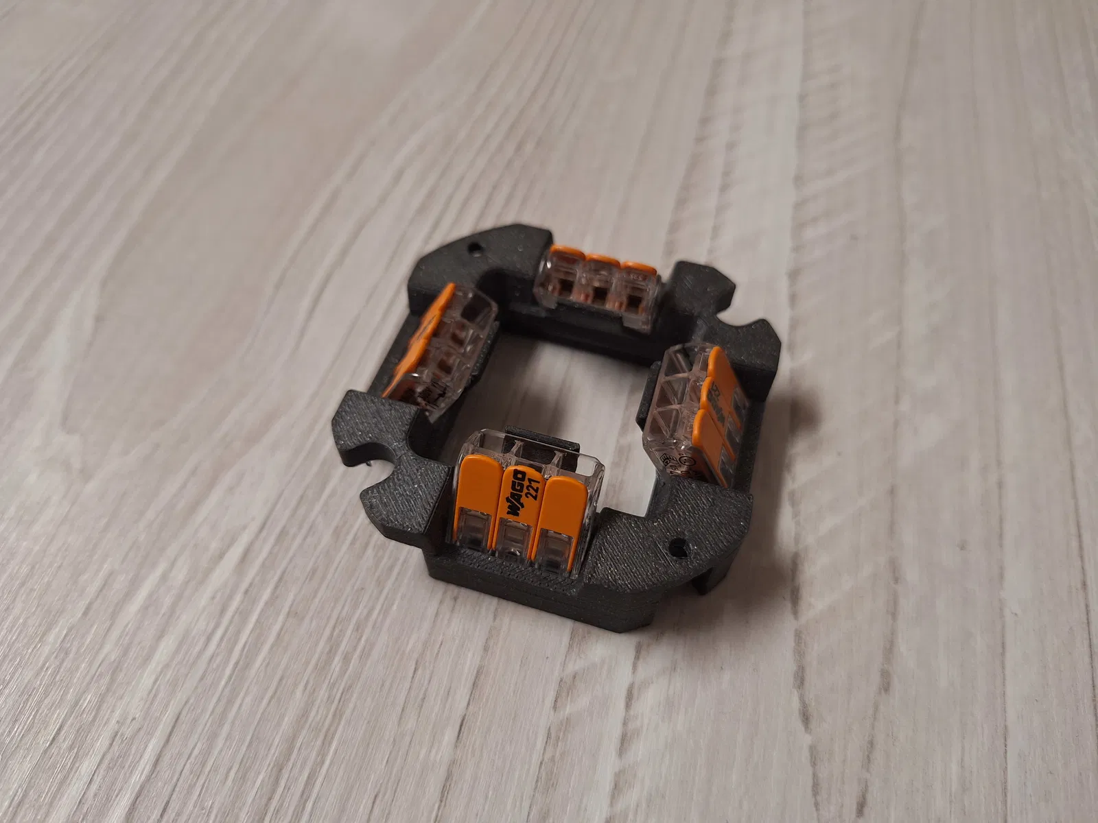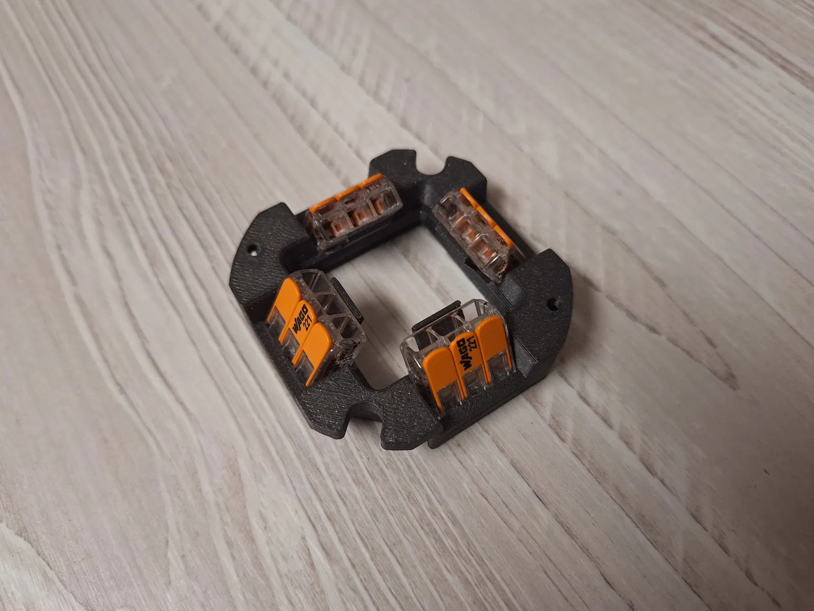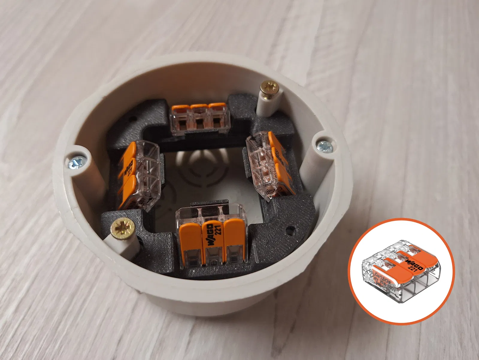 Bộ lắp ráp khối đấu dây cho hộp nối điện sử dụng các kẹp cần gạt WAGO 221-413 (đầu nối lò xo 3 dây dẫn). Cung cấp kết nối an toàn và đáng tin cậy cho dây điện bên trong hộp. Phù hợp cho việc đấu dây nhanh chóng và không cần dụng cụ.
